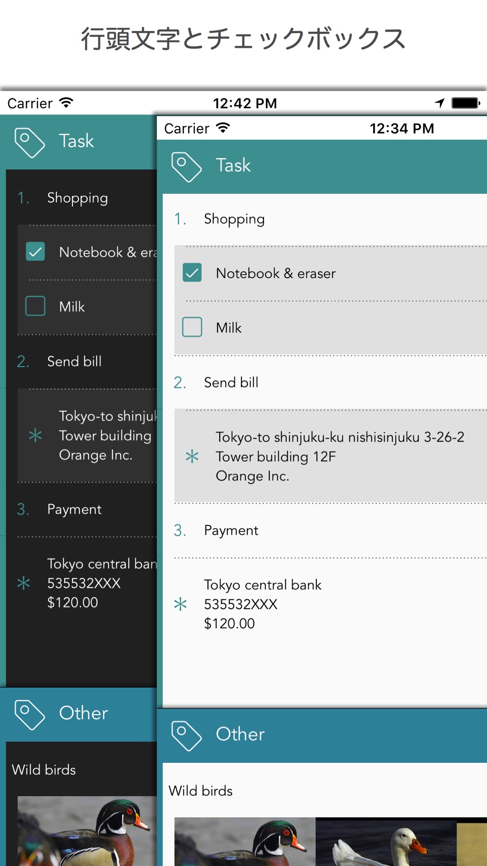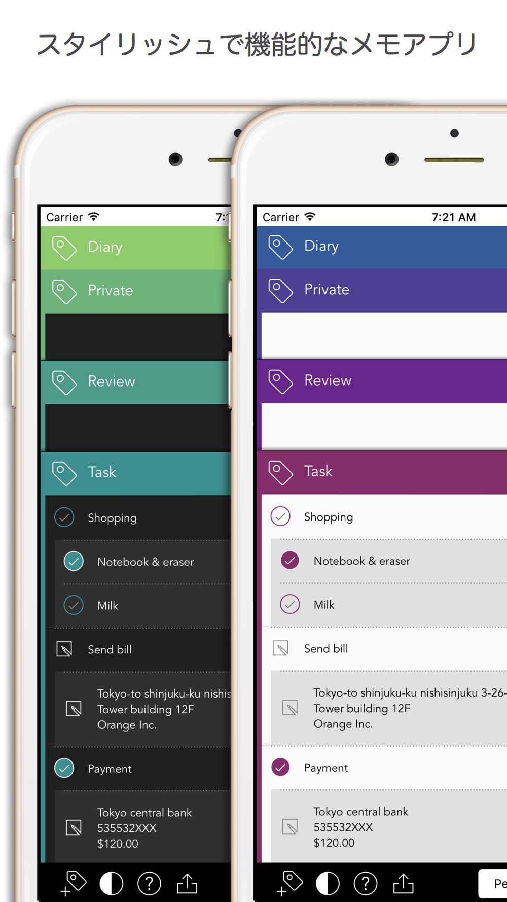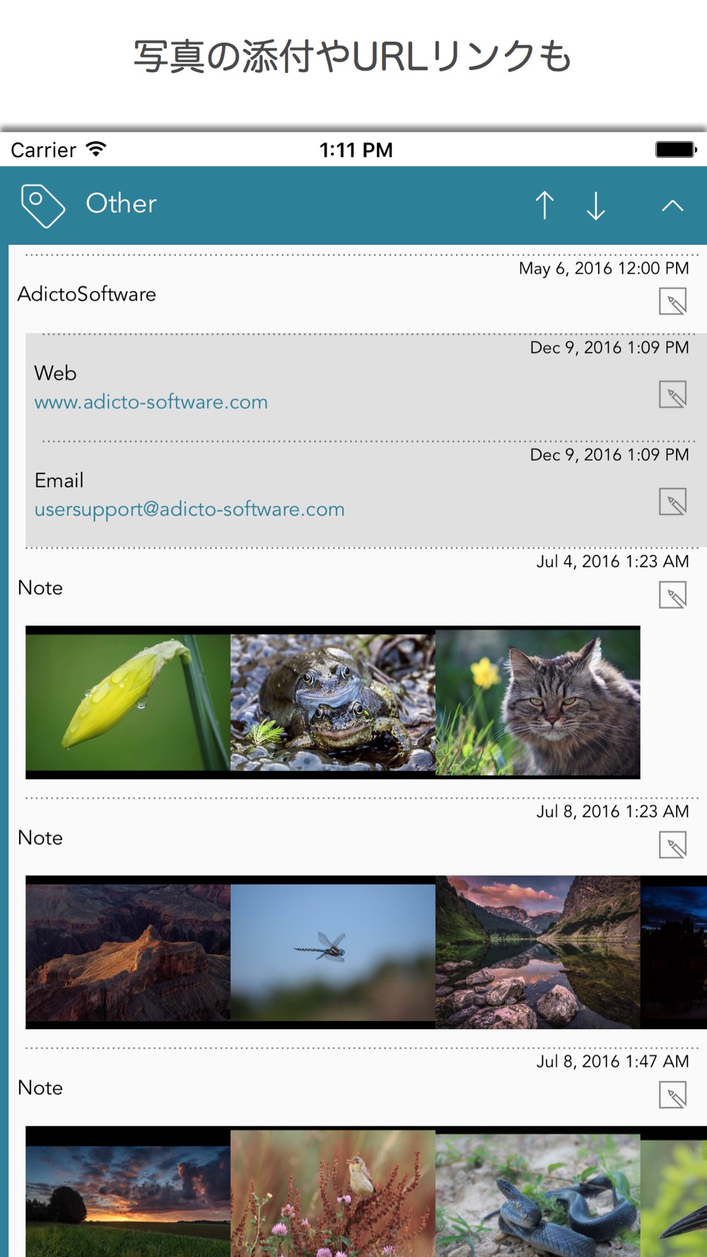 タグ分類、階層化、写真の添付、リマインダー登録、PDF出力等の機能を備えており、メモ、ノート、チェックリスト、ToDoリスト、簡単な日記として幅広く使用出来ます。