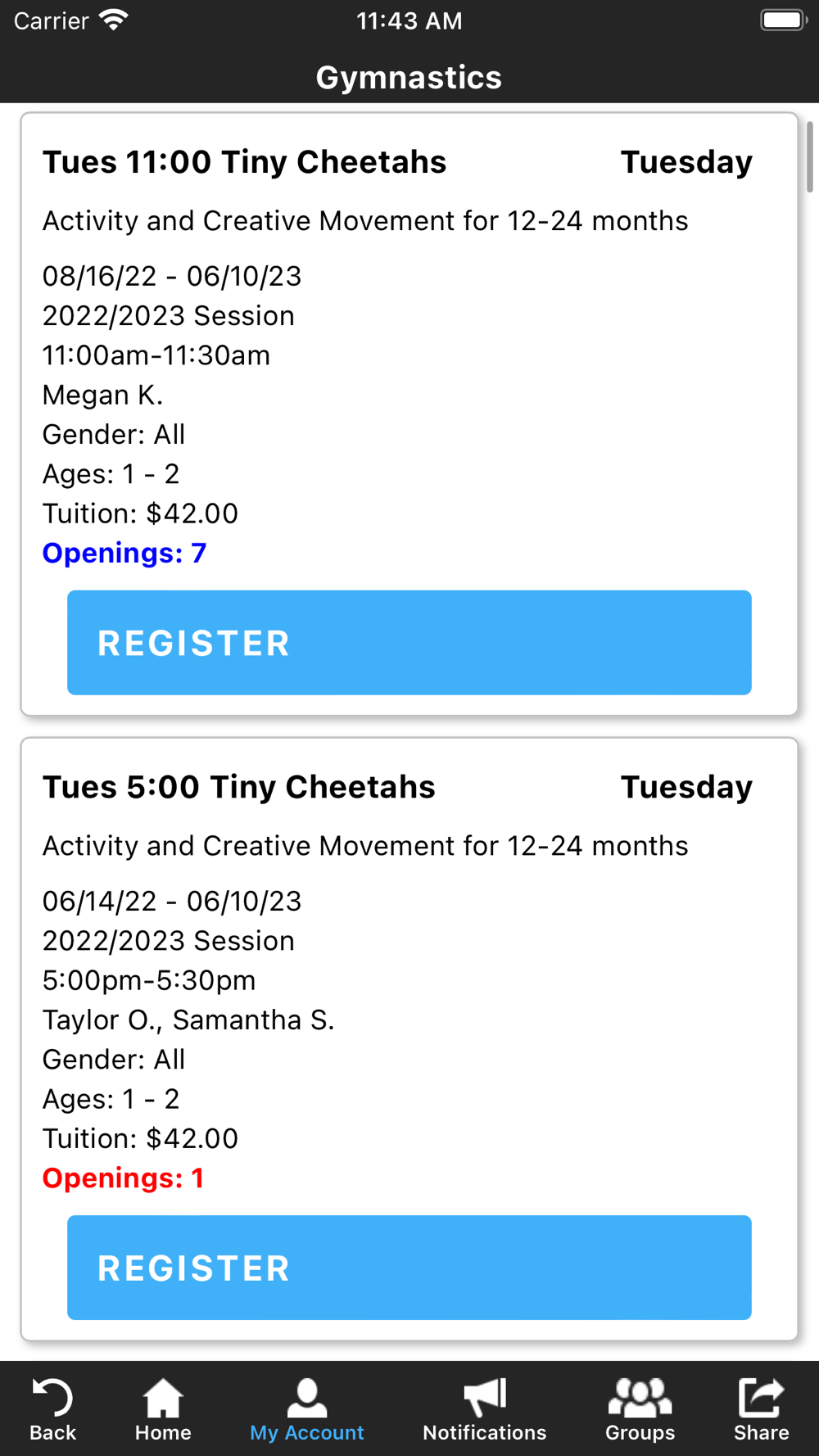 - Looking for the perfect class? Search by program, level, day, and time. You can register or even put yourself on a wait list.