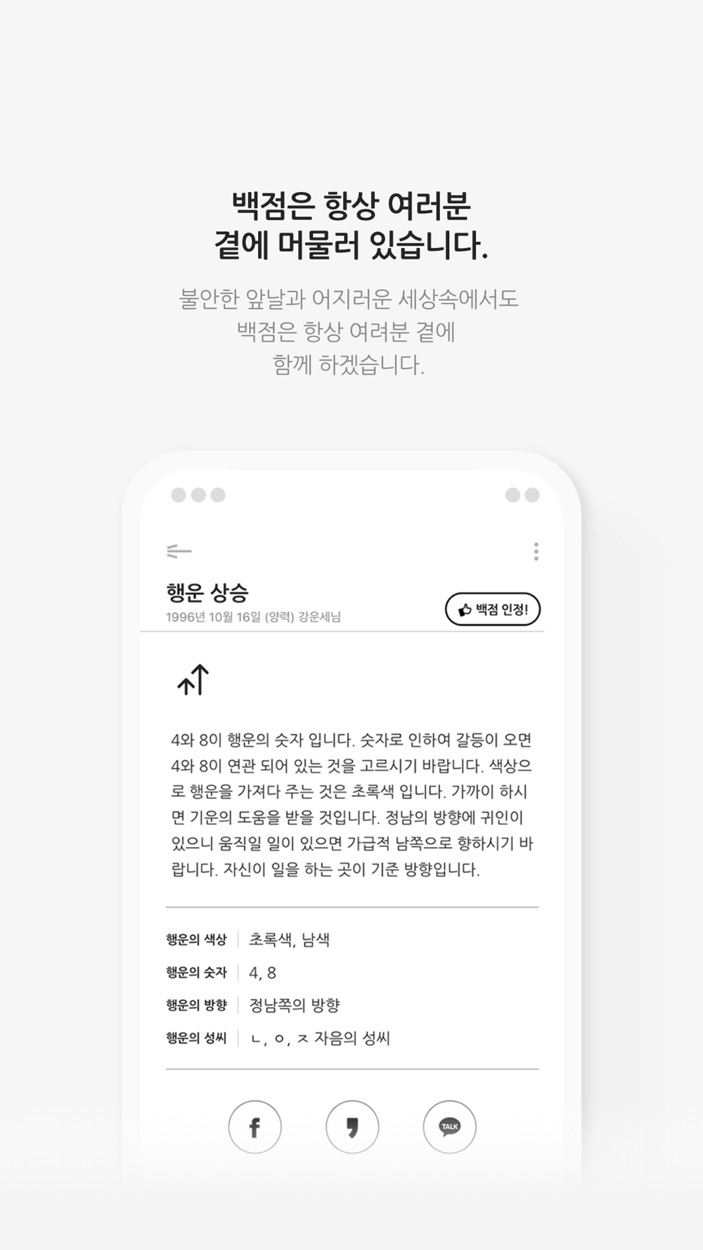 백점이 제공하는 운세·사주로 힘든 삶에 지친 무거운 마음이 한결 가벼워지는 한 해가 되시길 바랍니다. 백점은 언제나 당신의 행복과 안녕을 기원합니다.