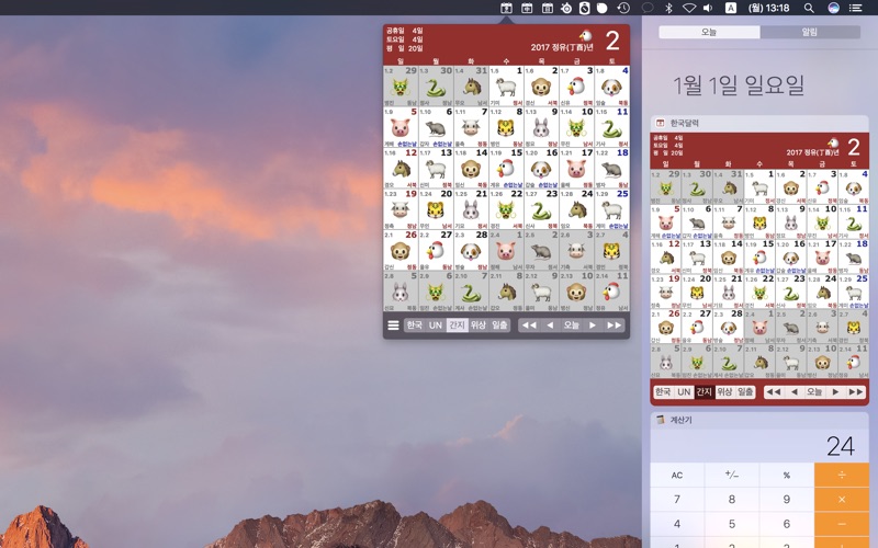 한국달력은 기본 달력은 물론 UN 기념일, 간지, 달의 위상, 일출/일몰 달력까지 다양한 달력이 포함되어 있습니다.