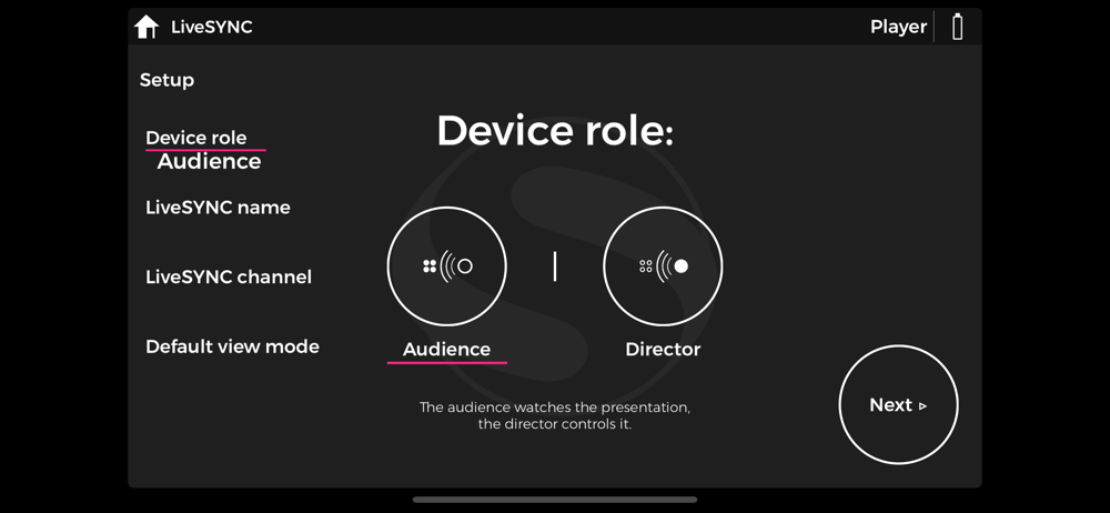 LiveSYNC is really easy to use: in the setup wizard you decide whether a device acts as the director or belongs to the audience, give a distinctive name for the device so that you can identify them, and reserve a communication channel for your presentation. After copying your media files in place you are ready to go.