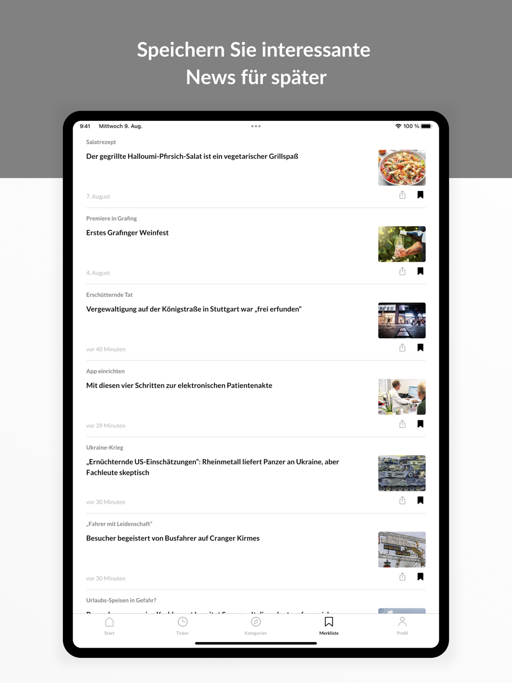 Außerdem können Sie interessante Meldungen über die Bookmark-Funktion speichern und später in Ihrer Merkliste abrufen sowie alle Artikel teilen.