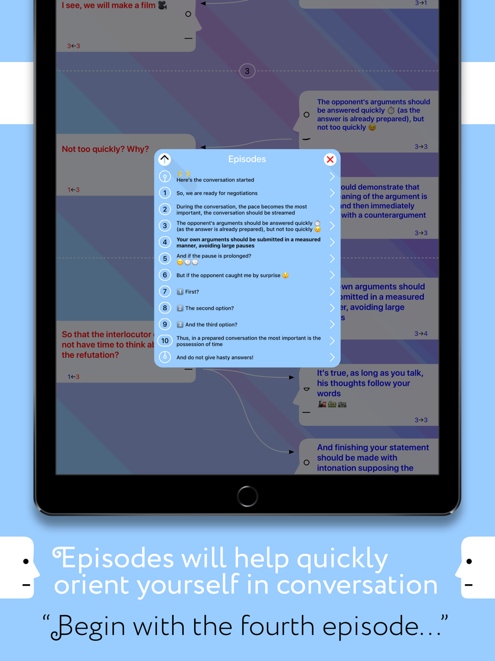 Build a conversation script, think through the questions and your answers — all this in a simple visual form is always at hand, with full synchronization across all mobile devices via iCloud. Do not invent answers in a hurry, think them out in a calm environment with a cold head, let your opponents hurry and get lost with the thought.