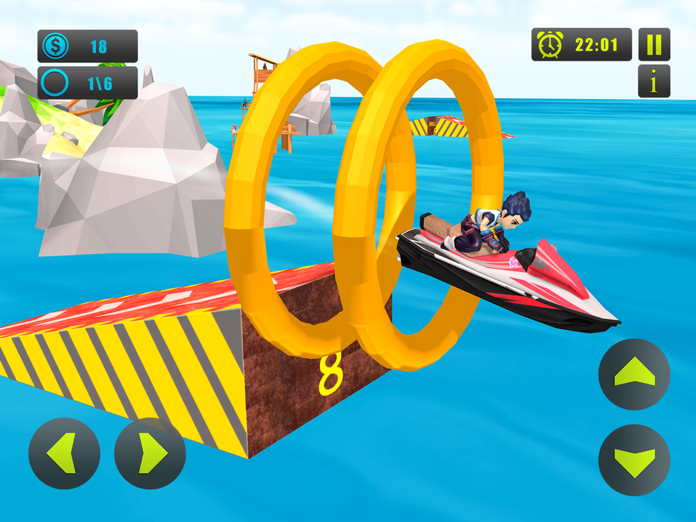 Embark on a water boat with an awesome jet ski driving experience performing ultimate skiing stunts to feel the summer splash. In this game you will get best experience of power boat racing with jumps and stunts using jet ski racing simulator. In this game not only you will have to become jet ski driver of speed power boat racing, kids water surfing bike, you will have to collect various achievement objects in many stunning levels of this game using your fastest surfing bike driving skills to unlock other water boats having jet ski simulator. Enjoy & drive jet ski racing- power boat wearing life jacket in water surfing bike race adventure. This game arrives with fastest water scooters which are ideal for jet ski beach rescue lifeguard driver or jet ski rider who loves to perform exciting stunts with passion.