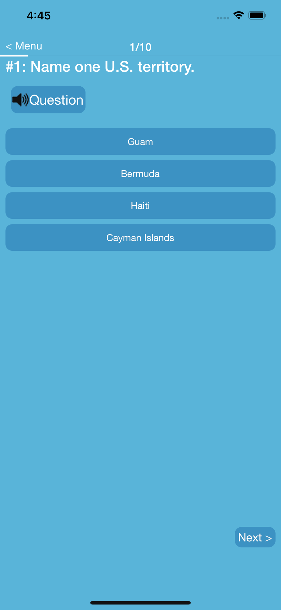 With this US Citizenship Test (PRO version) app, you can use it to study and prepare for the US citizenship final interview. In order to become a US citizen you will need to answer at least six out of ten questions correctly. This pro version doesn't contain any ads.