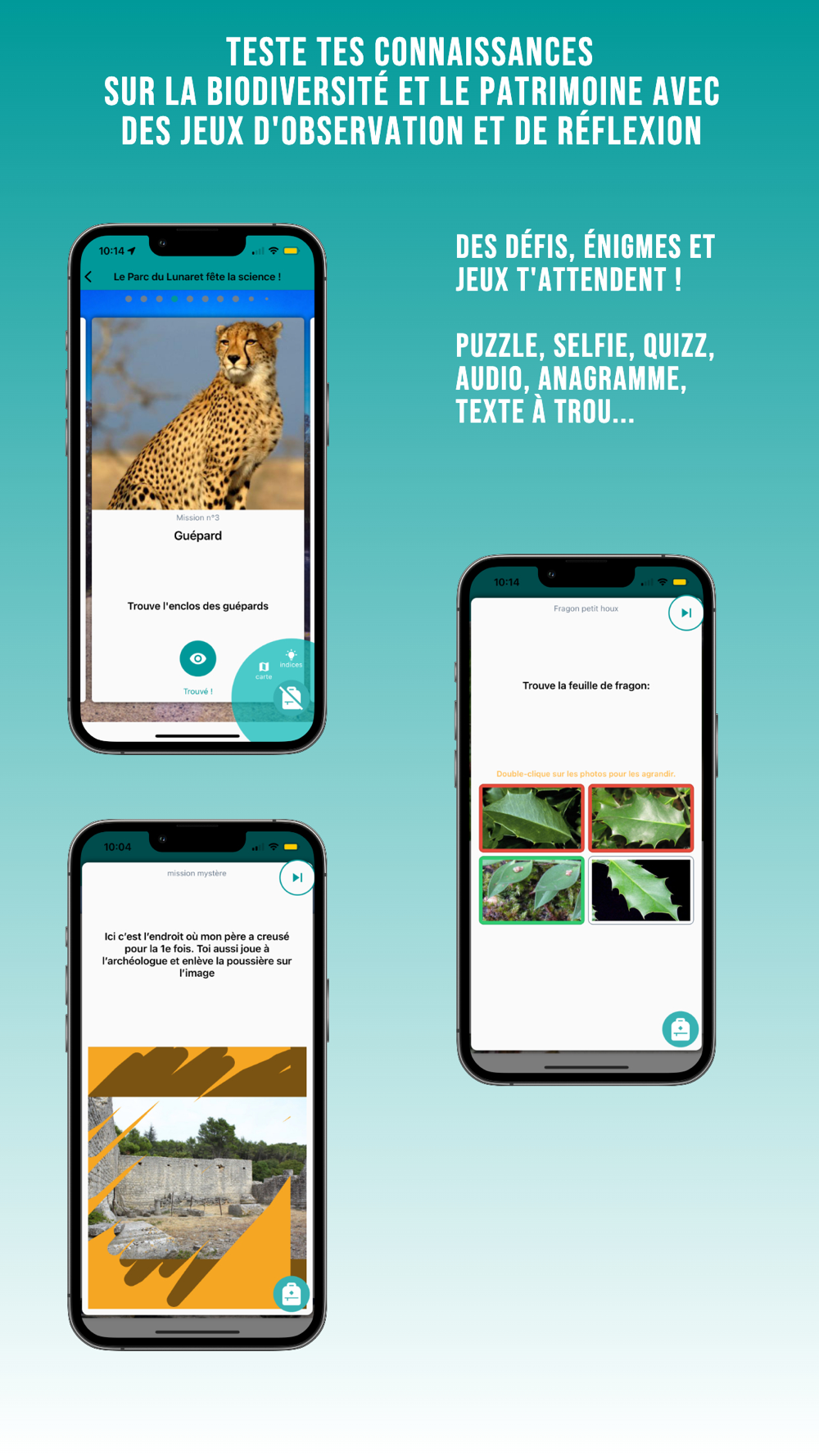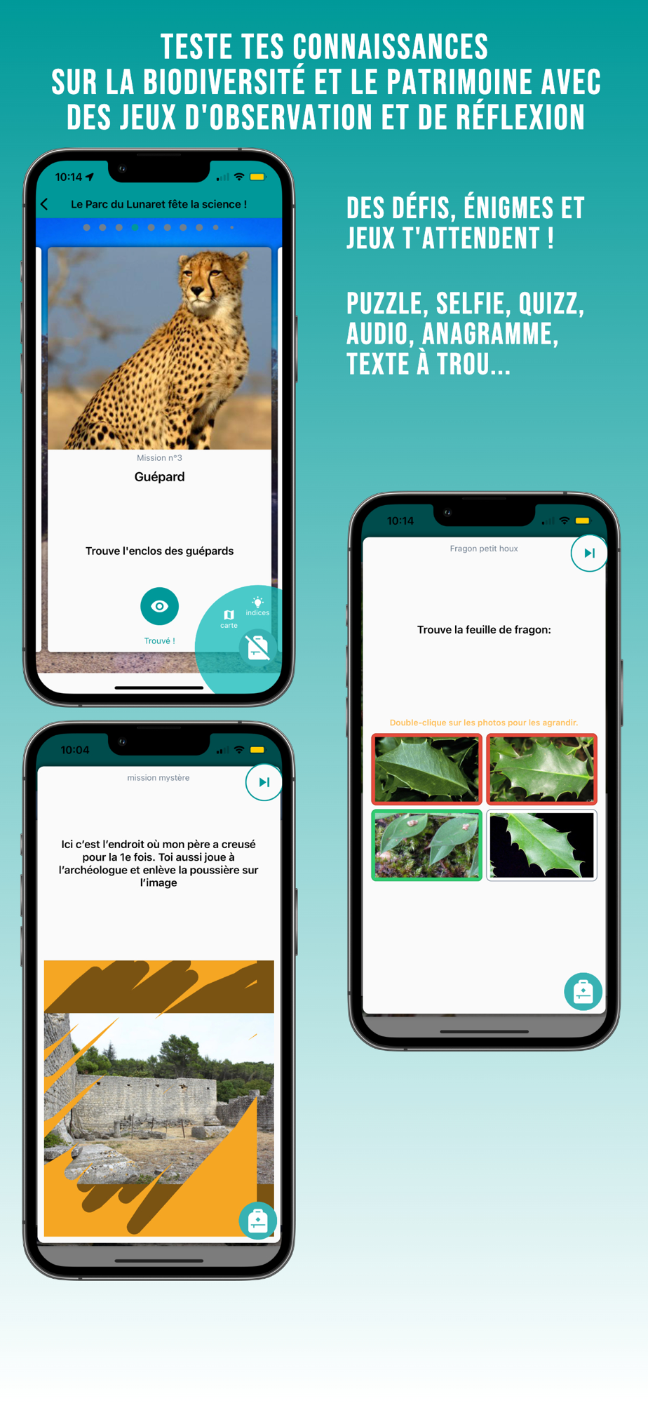 2. Apprends-en plus sur les espèces et ces lieux. Pour cela, résous des énigmes en faisant des jeux puzzle, répond à des quizz image, texte et audio etc…