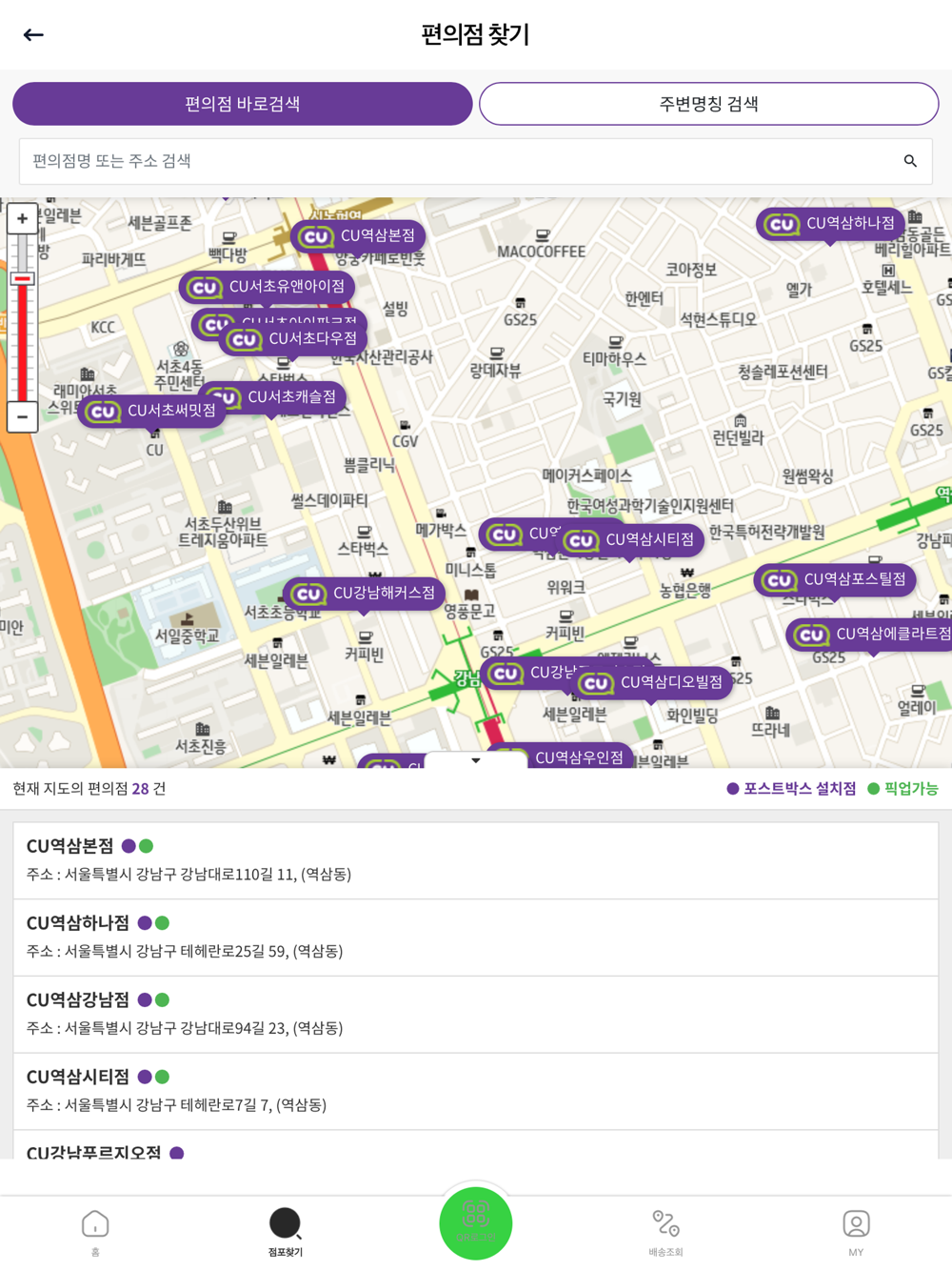 편의점 찾기 : 택배 서비스 이용이 가능한 CU점포를 검색하여 위치 확인이 가능합니다.