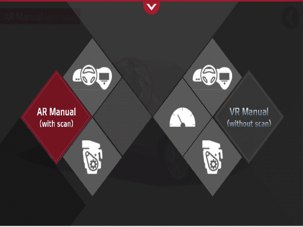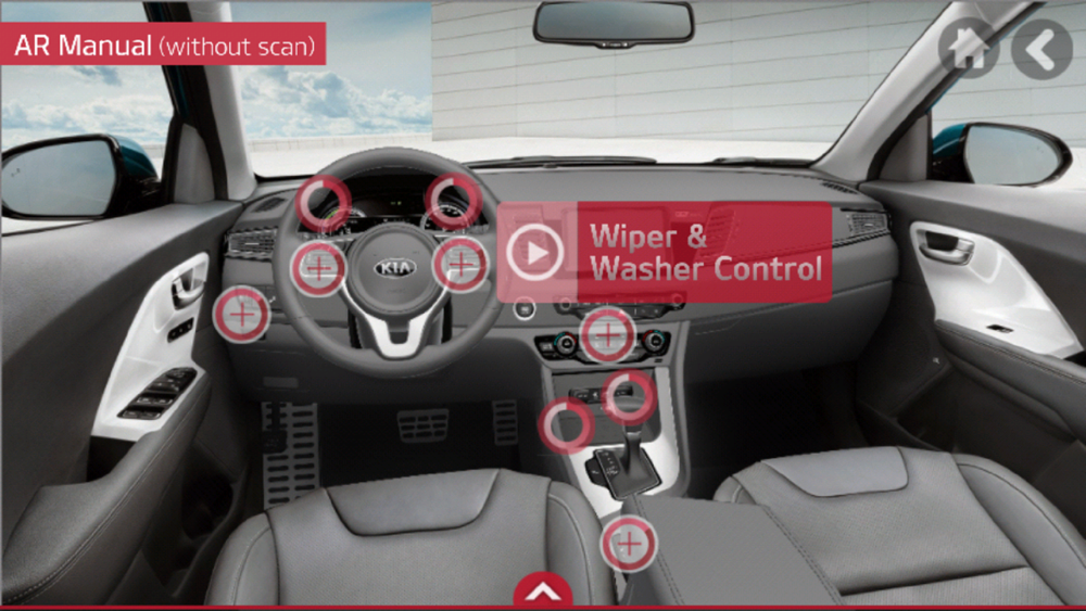 - 스마트 폰 카메라와 AR 기술을 활용하여 차량의 실내 및 엔진 실을 스캔 한 후 사용 가능한 관련 정보가 스마트 폰 화면에 표시됩니다. 사용자가 원하는 아이콘을 터치하면 관련 설명동영상이 재생됩니다.