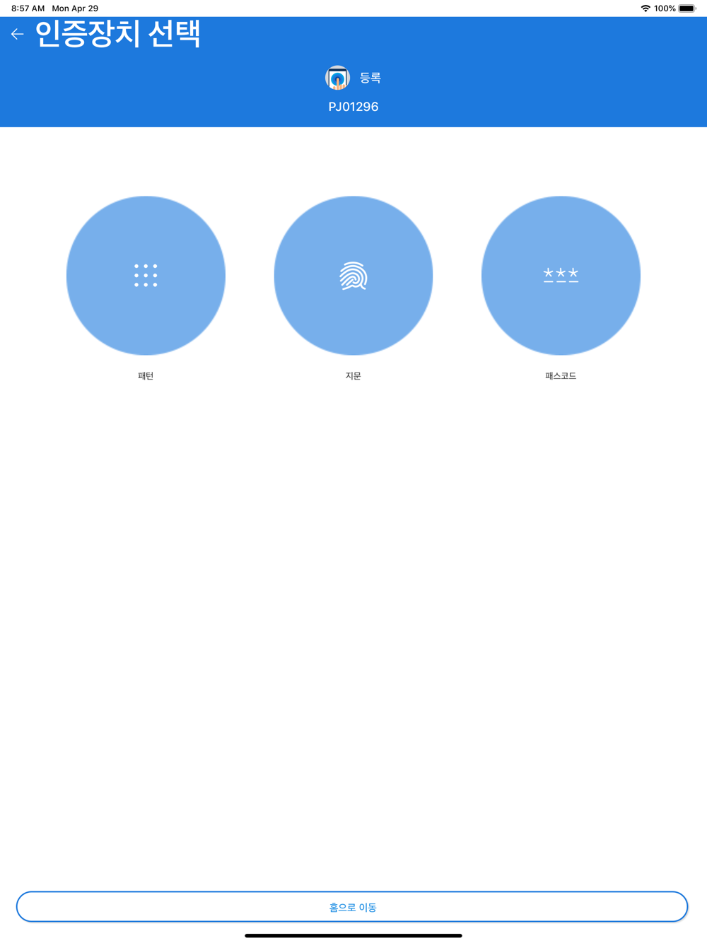 * 등록: 사용자를 인증대상으로 등록합니다. (지문, 패턴, PIN)