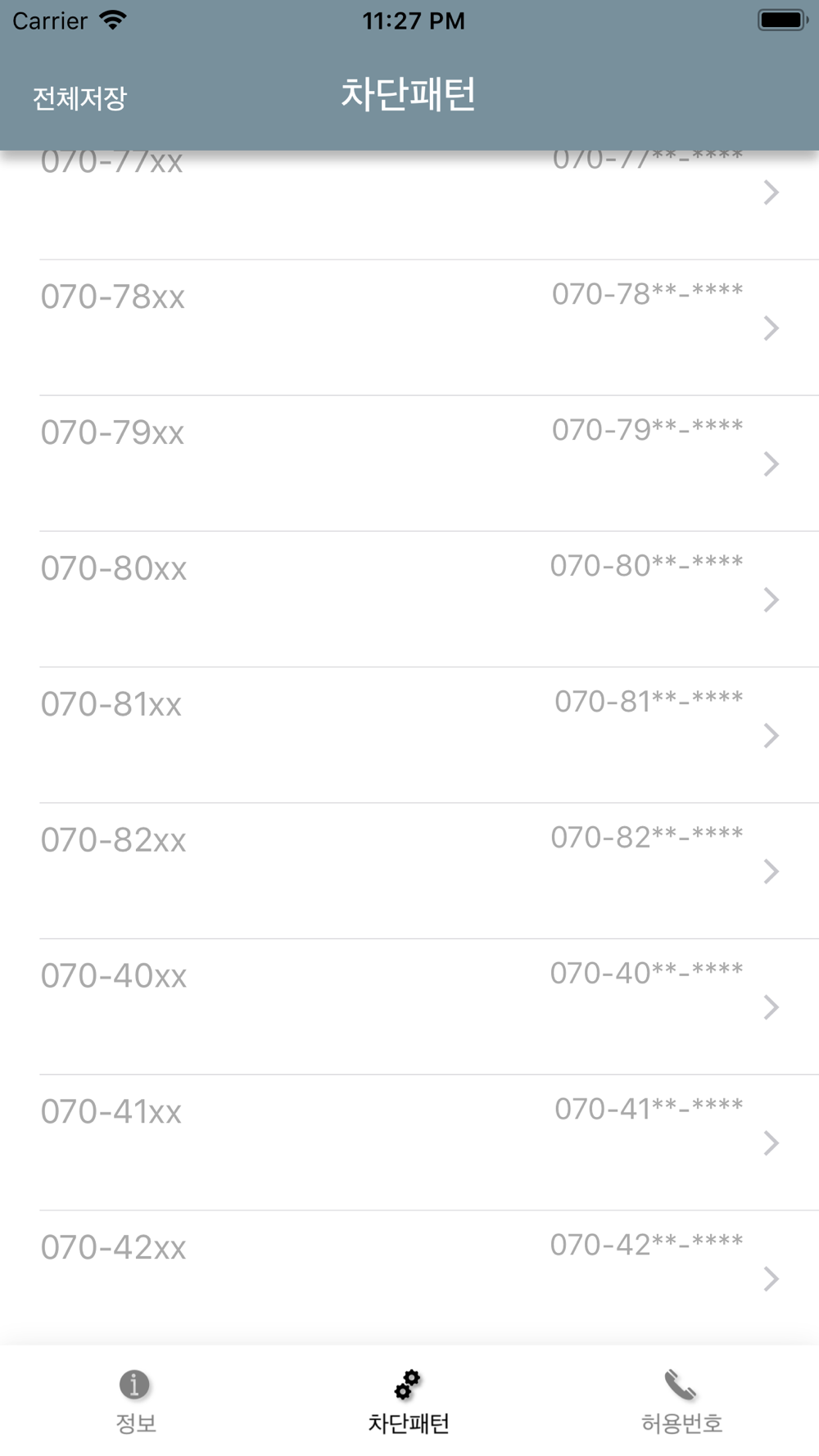 한국에서 사용되는 인터넷 전화 국번 23개에 대한 차단 패턴이 정의되어 있으므로 원하는 국번을 선택하여 스위치를 켜면 해당 국번에 속하는 모든 전화번호가 차단됩니다.