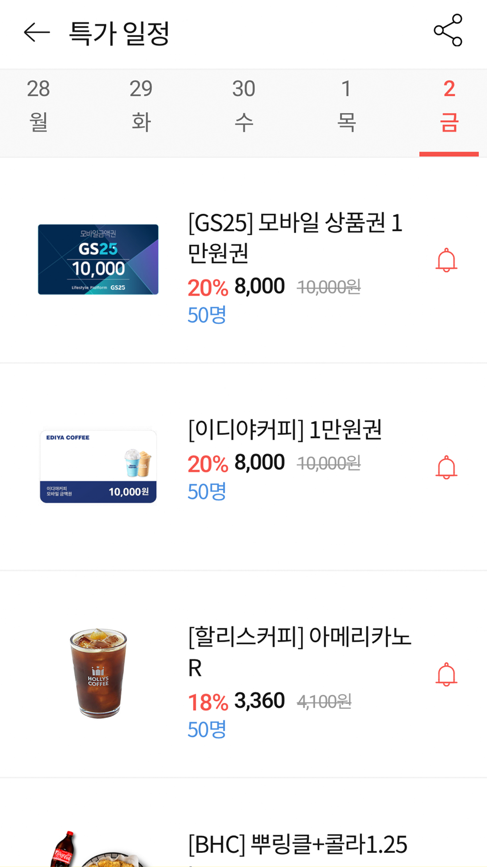 편의점, 커피, 치킨, 베이커리, 피자, 버거, 상품권, 문화상품권 등