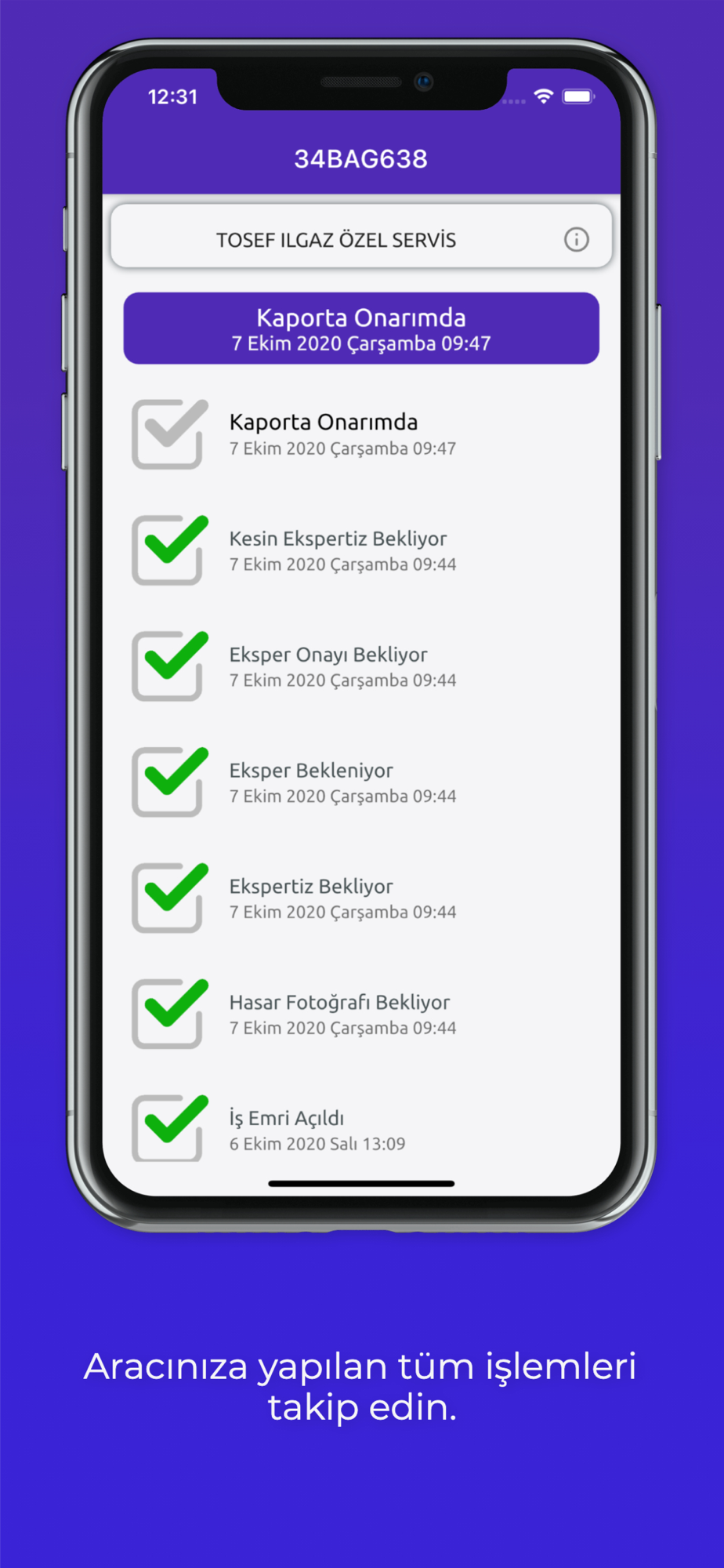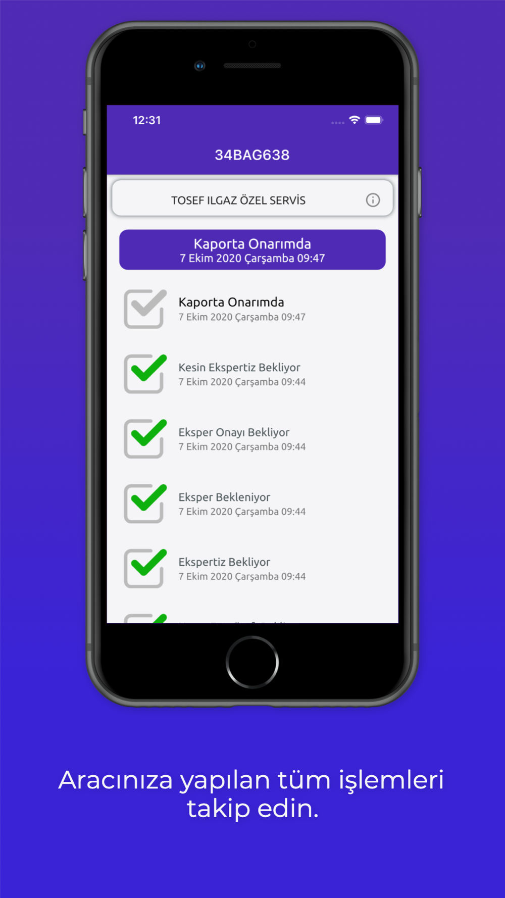 TOSEF üye işyerlerinde onarımda olan aracınızın işlem durumunu mobil uygulamamız ile kolayca takip edebilirsiniz.
