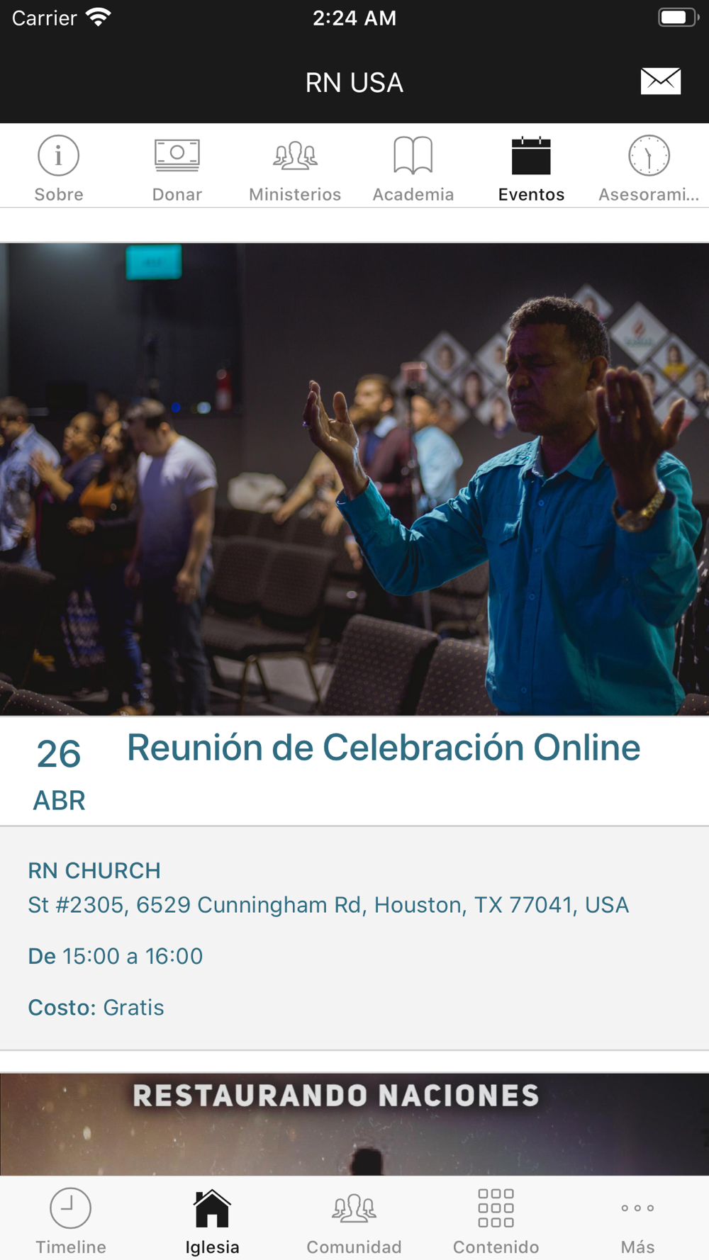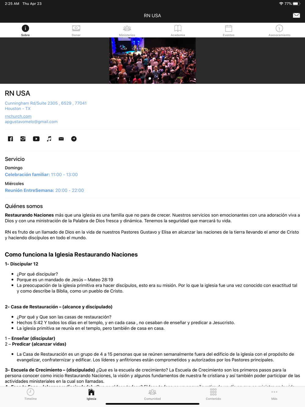 - Información de la iglesia (dirección, teléfono, sitio web, redes sociales, pastores)