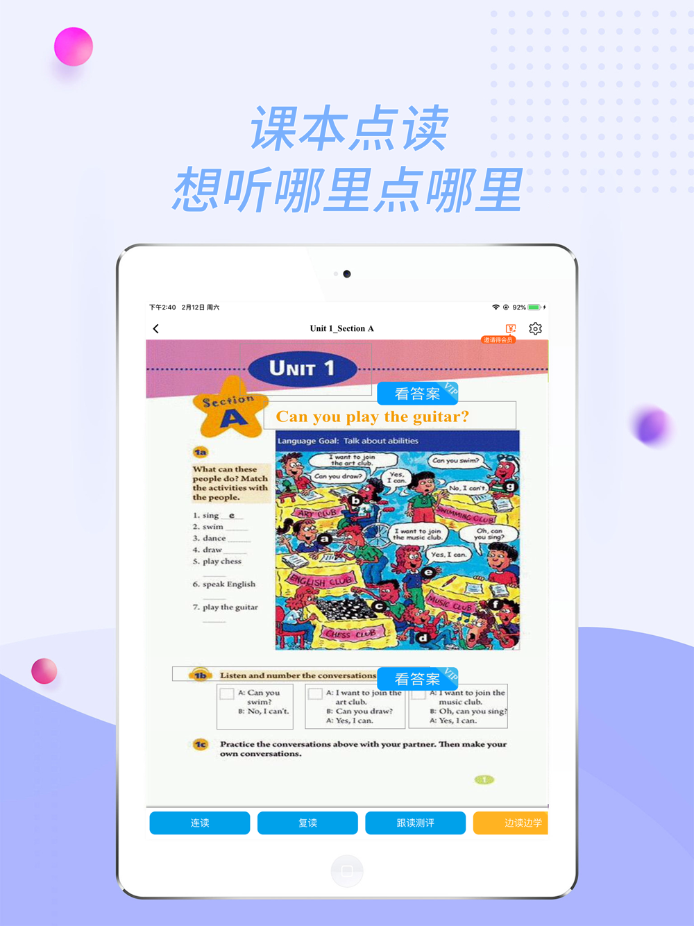 1)课本学习:同步校内外课本,沉浸式体验课本,支持课本点读、连读、复读、跟读测评,还有课本翻译、课后小练习看答案、课本听力文稿等;