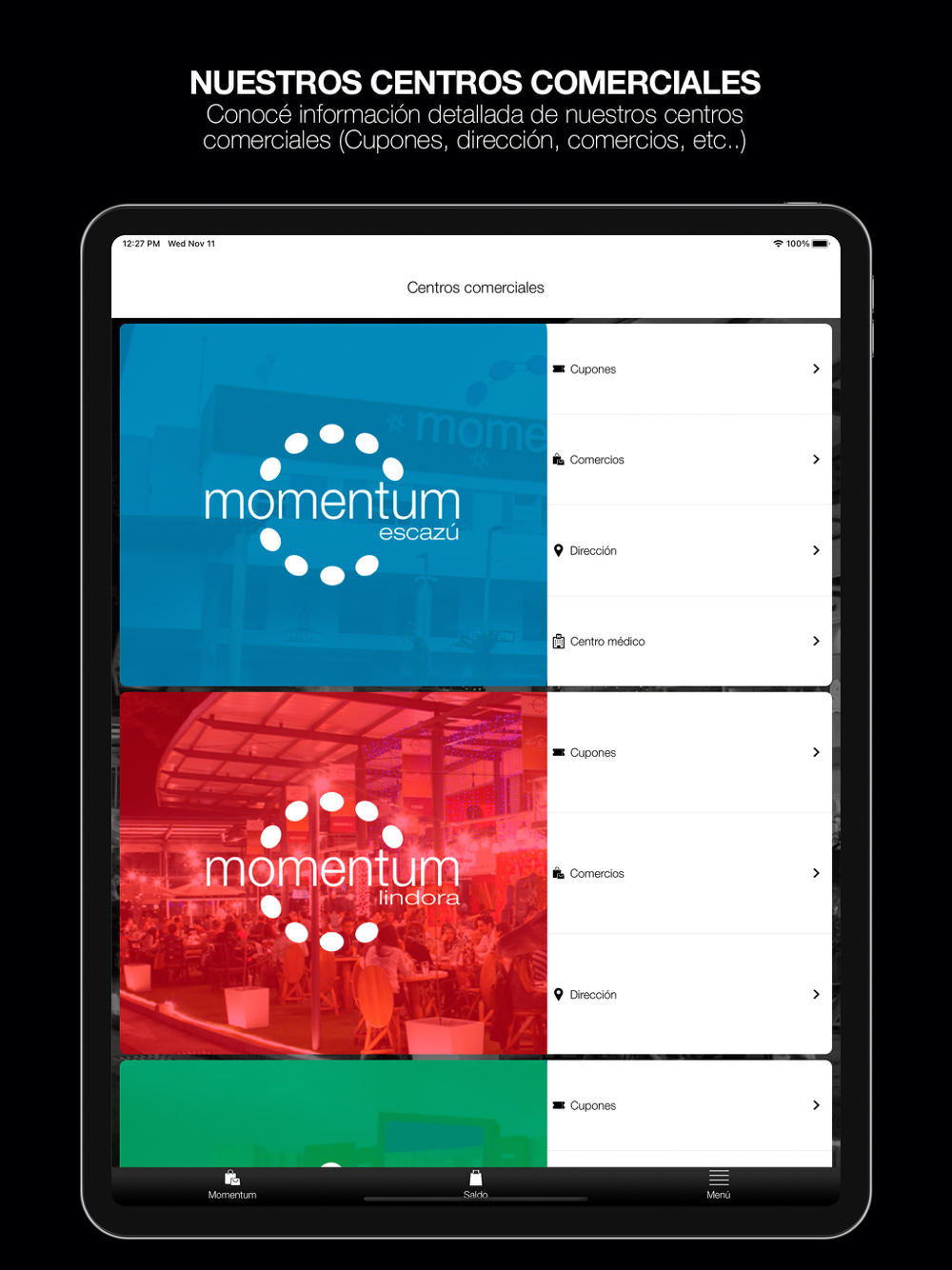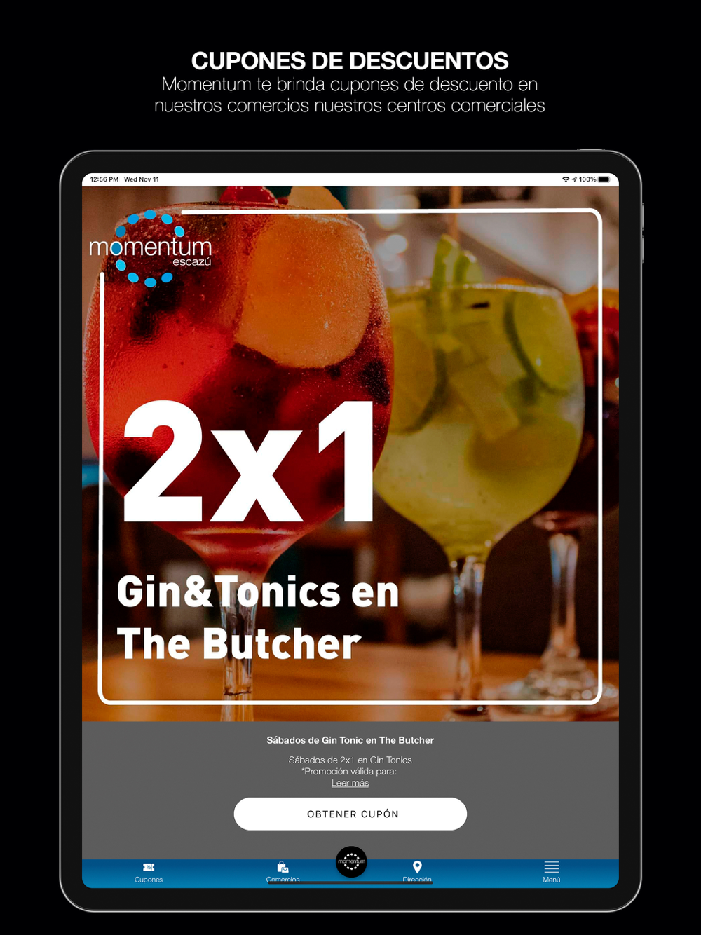 La aplicación cuenta con un directorio comercial que incluye la información general de cada uno de los servicios, comercios y restaurantes que se encuentran en los centros comerciales. Además de que en la aplicación se pueden encontrar cupones de descuento redimibles en los diferentes comercios, servicios o restaurantes que se encuentran en Momentum Pinares, Lindora o Escazú.