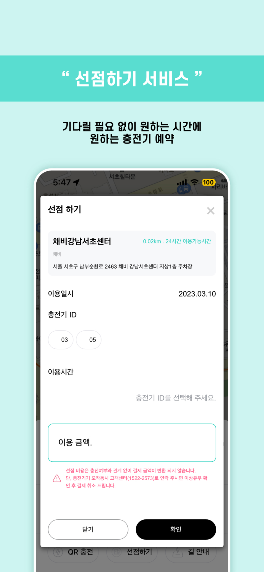 - 충전기 앞에서 더 이상 기다릴 필요 없습니다. 채비의 선점하기 기능으로 원하는 충전기를 원하는 시간에 예약하여 충전소 도착과 동시에 충전하실 수 있습니다.