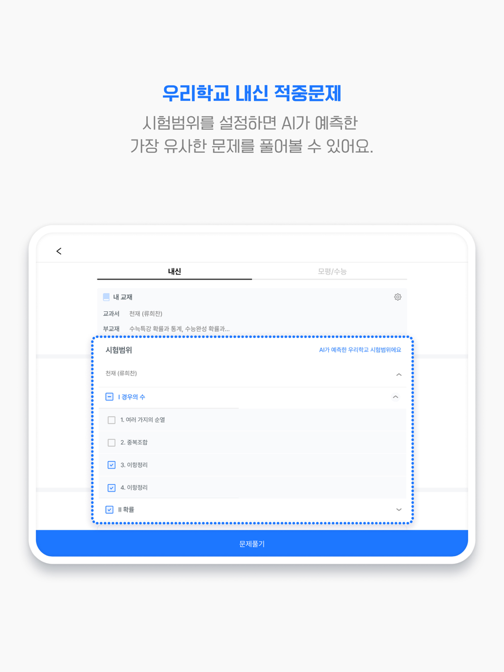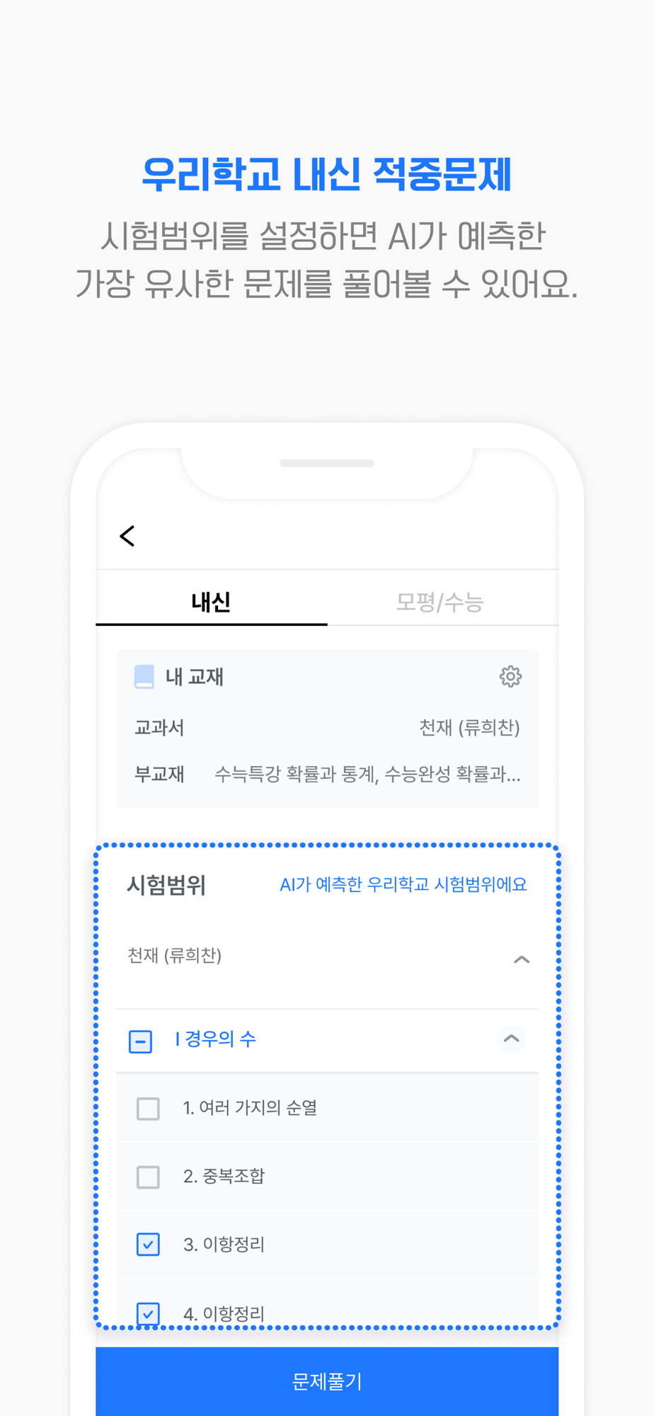 학교 시험 범위 문제들만 골라서 풀고 내신 완벽 대비하자!