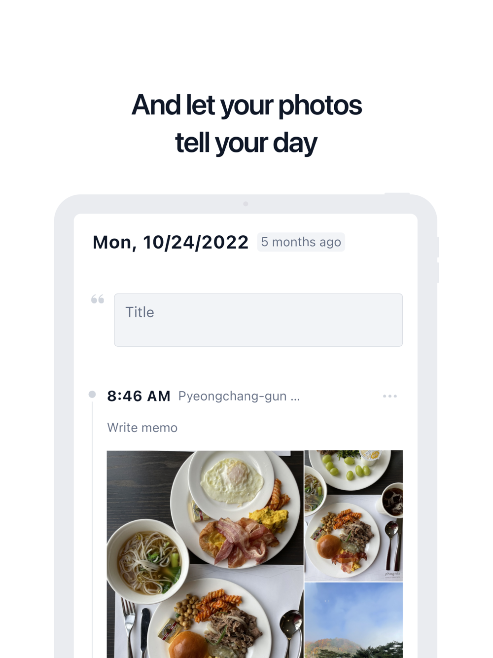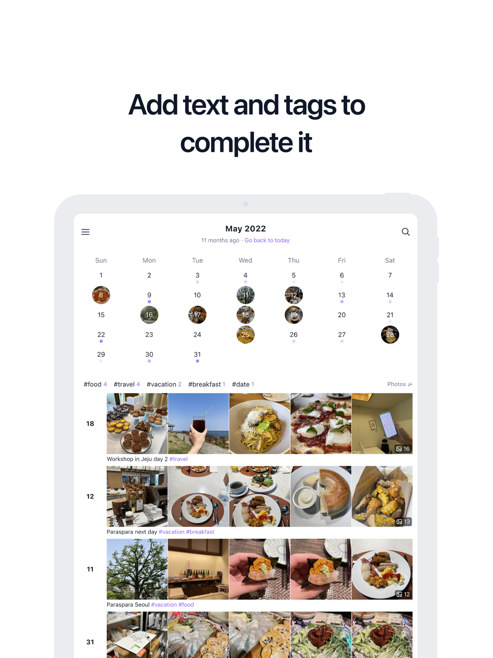 Simply click on a date and let it automatically create a beautiful entry with the photos of that day.