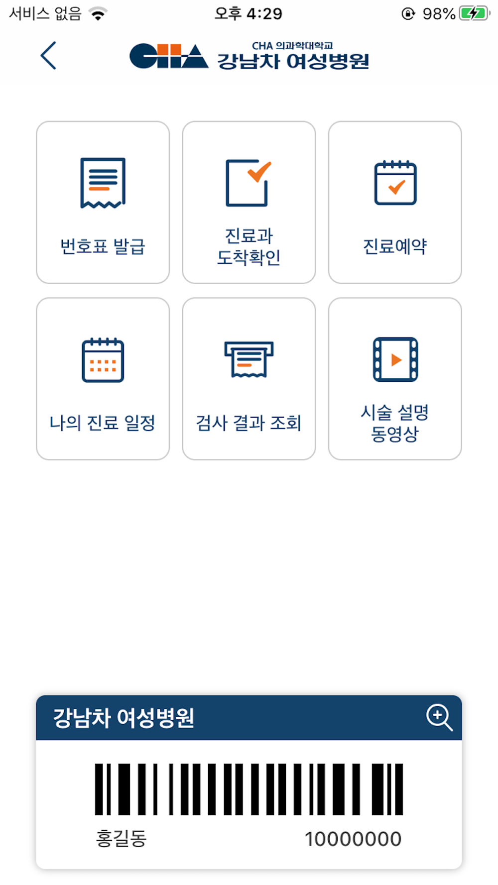 본 App은 '강남차 여성병원'에서 사용되는 App으로서 모바일 번호표 발권, 모바일 도착확인, 모바일 진료카드, 모바일 진료일정안내 등의 기능을 포함하고 있습니다.