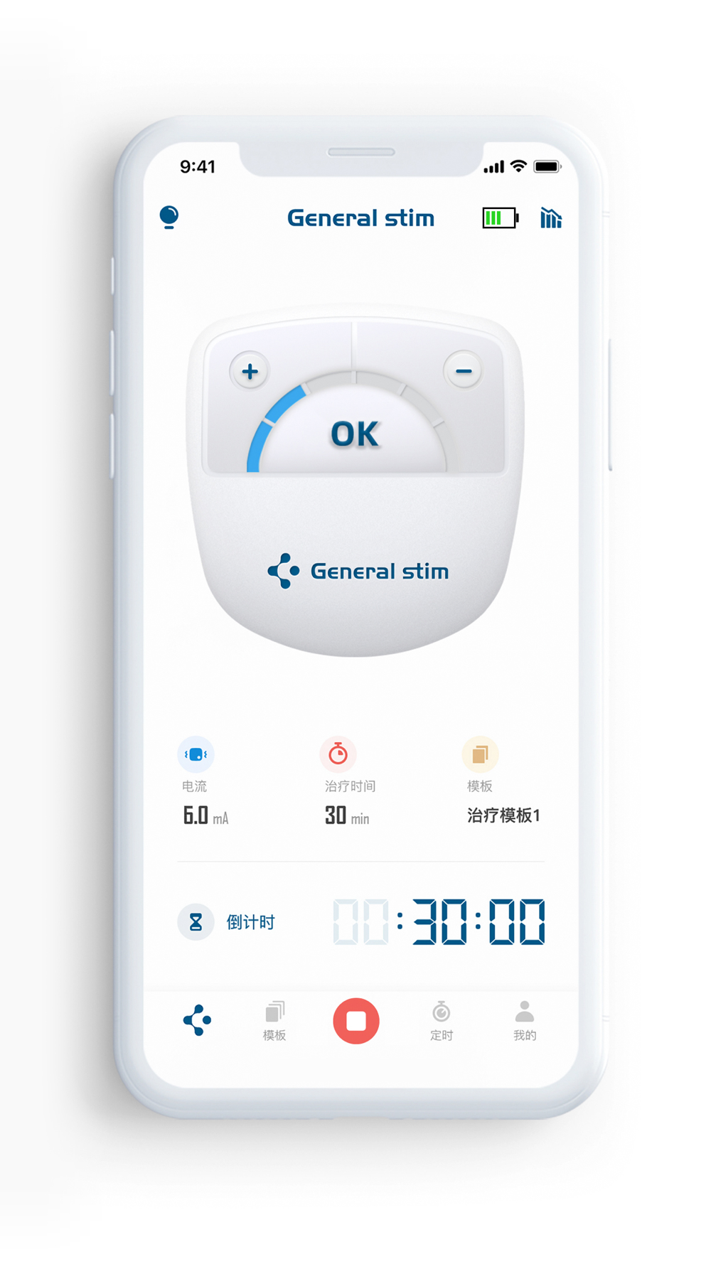 TTNS APP是可穿戴型胫后神经治疗系统的程控软件部分,它通过蓝牙接口与可穿戴设备进行配对连接、程控体外可穿戴设备,用于产生特定参数的微弱电脉冲信号,作用于体外脚踝部胫后神经达到对膀胱相关疾病的康复锻炼及治疗作用。