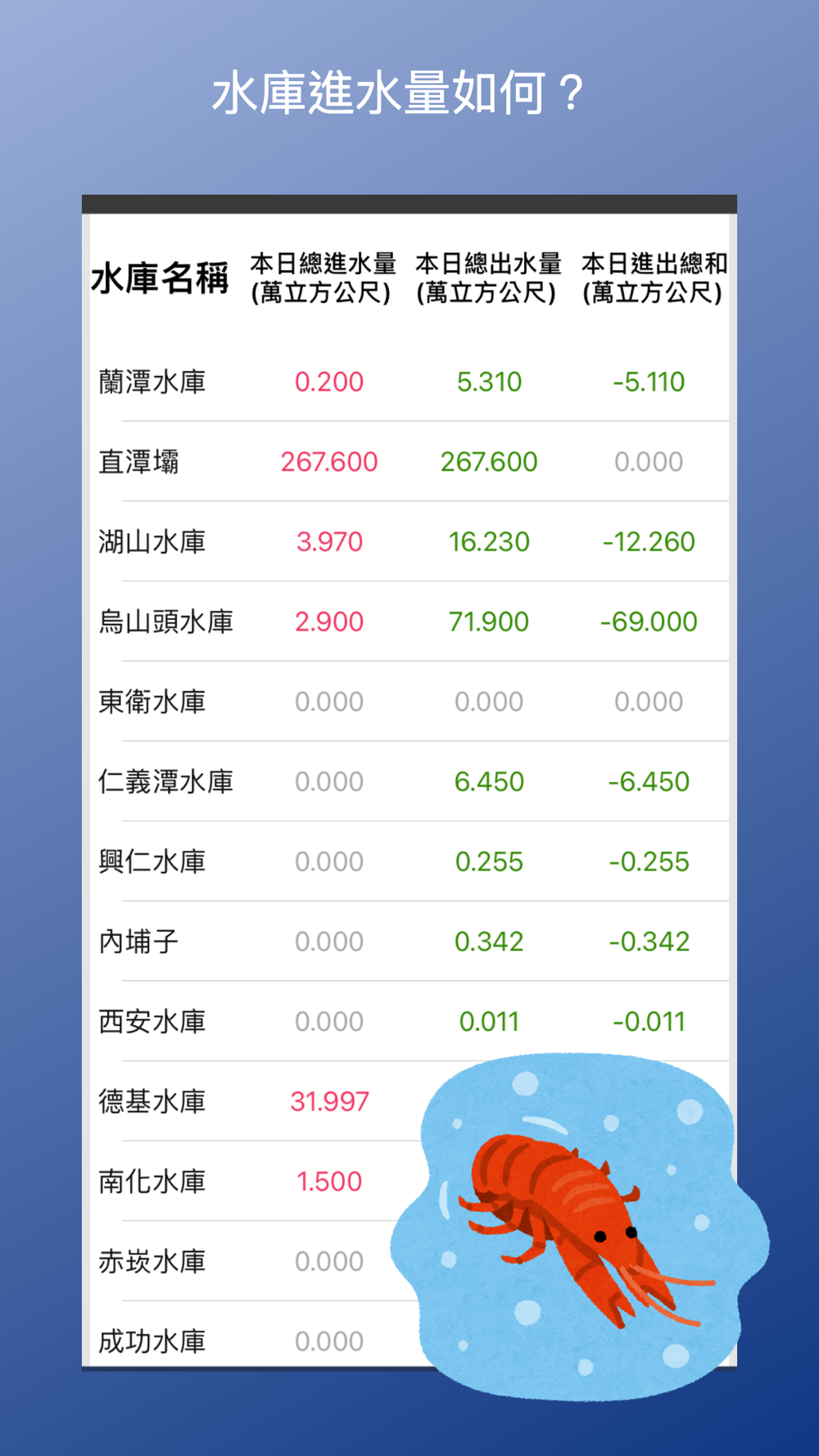 讓使用者知道附近水庫位置、水量、降雨進入量等