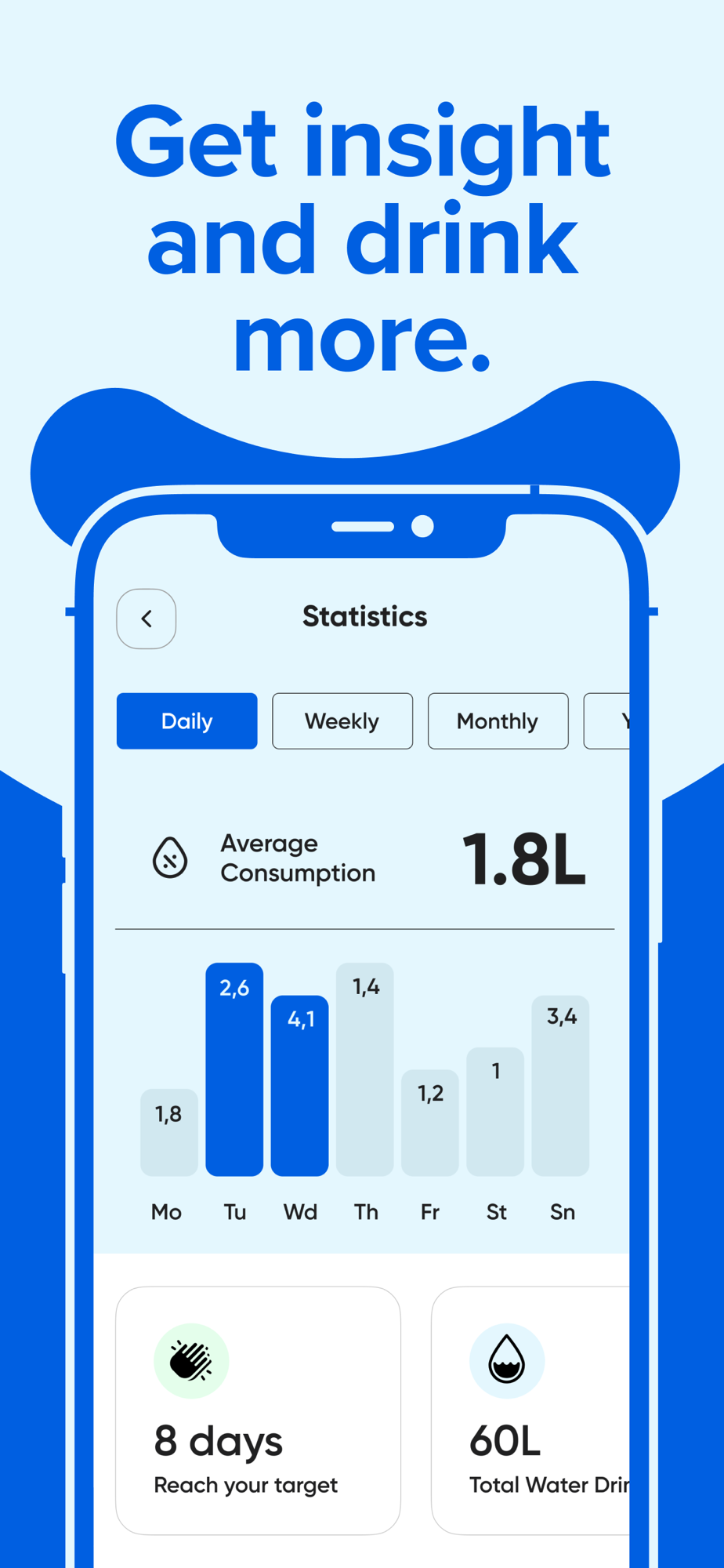 Don’t worry about forgetting to log your consumption! The app will let you know when it's time for another drink and remind you to have a glass of water. You will effortlessly drink more water and will be amazed by its beneficial effects on your body, health, and appearance.