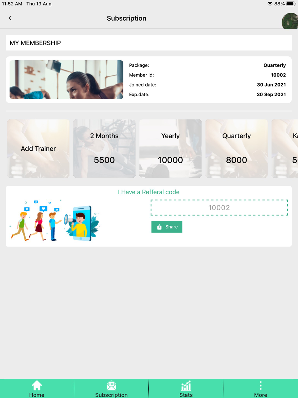 Subscription Profile: Stay updated about your subscription ID, cost, date of registration, expiry and preferred personal trainer's fee.
