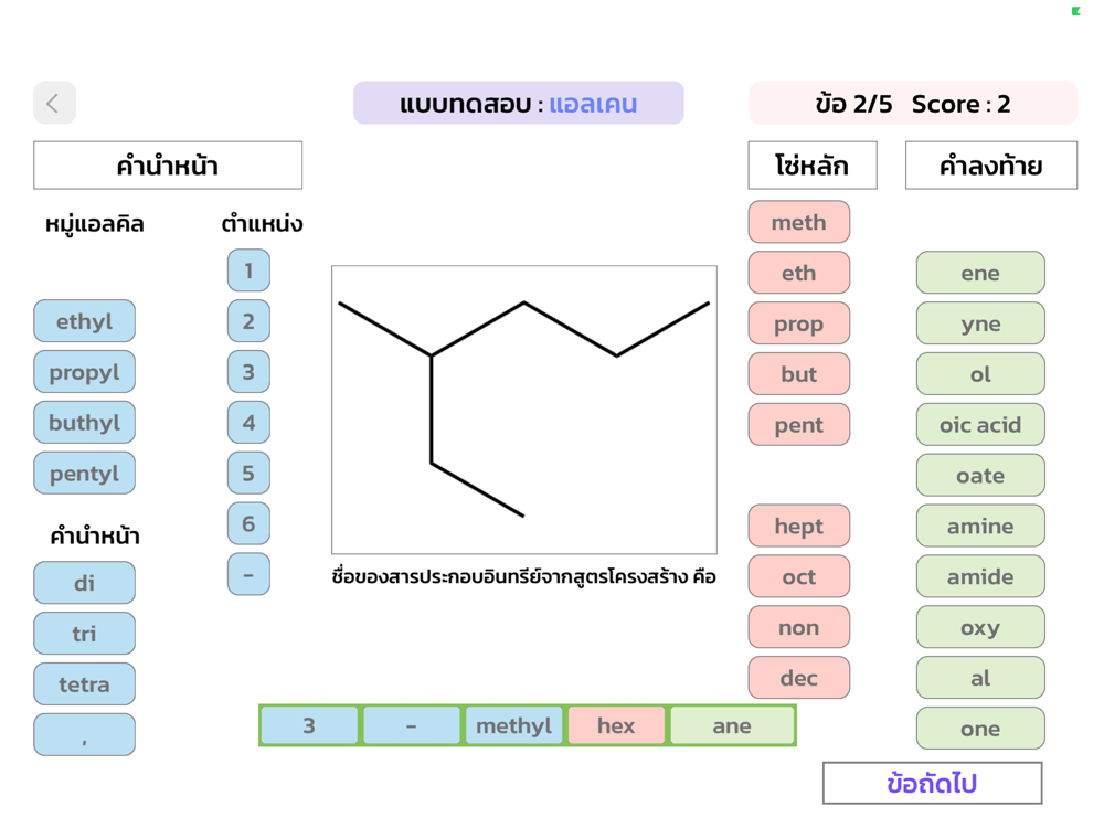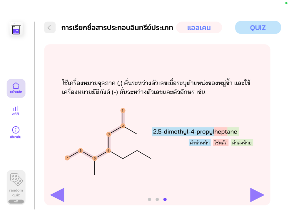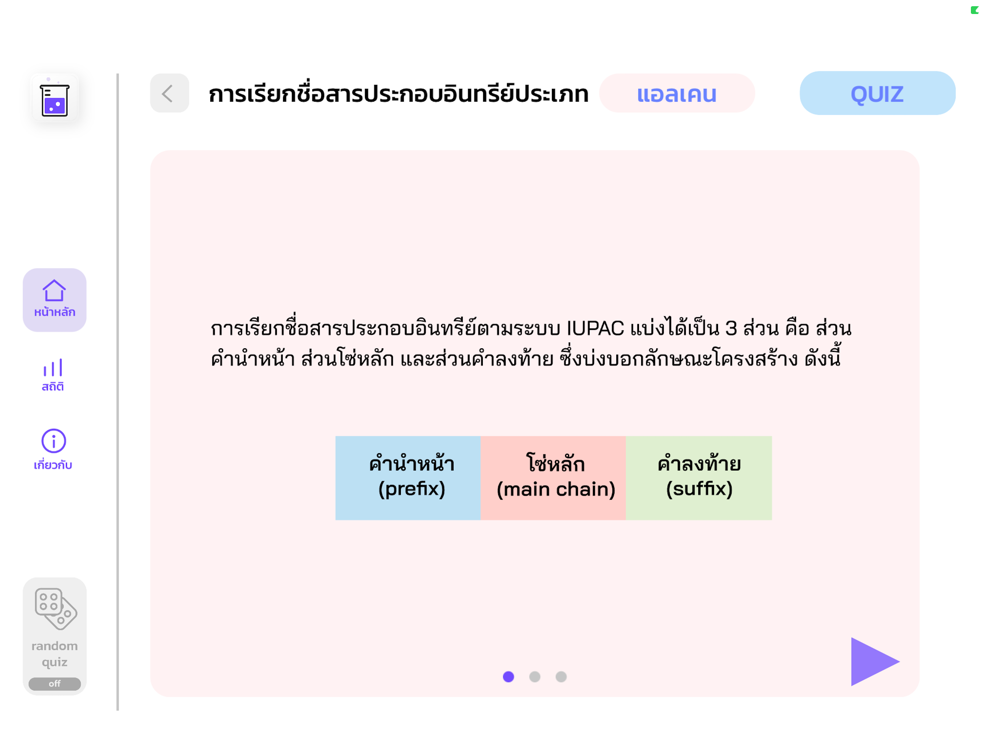 แอปพลิเคชันการเรียนรู้การเรียกชื่อสารอินทรีย์ตามบทเรียนในระดับมัธยมศึกษาตอนปลายด้วยระบบการเรียกชื่อแบบ IUPAC ซึ่งประกอบไปด้วยสารอินทรีย์ทั้งหมด 11 ชนิด ได้แก่ แอลเคน (alkane), แอลคีน (alkene), แอลไคน์ (alkyne), แอลกอฮอล์ (alcohol), อีเทอร์ (ether), แอลดีไฮด์ (aldehyde), คีโทน (ketone), กรดคาร์บอกซิลิก (carboxylic acid), เอสเทอร์ (ester), เอมีน (amine), และเอไมด์ (amide) โดยอธิบายหลักการการเรียกชื่อตามขั้นตอนอย่างละเอียด ตามระบบการเรียกชื่อสารอินทรีย์ในระบบ new IUPAC (2013) พร้อมยกตัวอย่างการเรียกชื่อสารแต่ละชนิด นอกจากนี้ยังมีเกมการเรียกชื่อสารมากกว่า 50 ข้อ ให้ฝึกกันอีกด้วย
