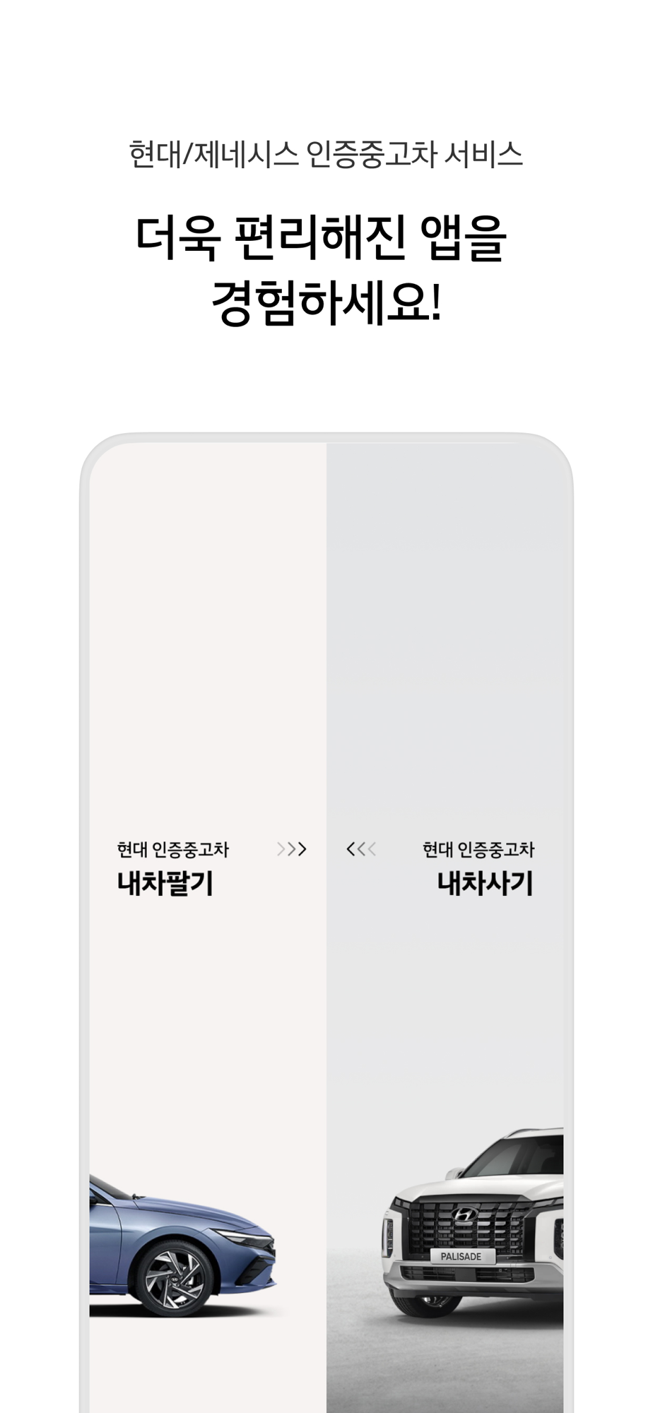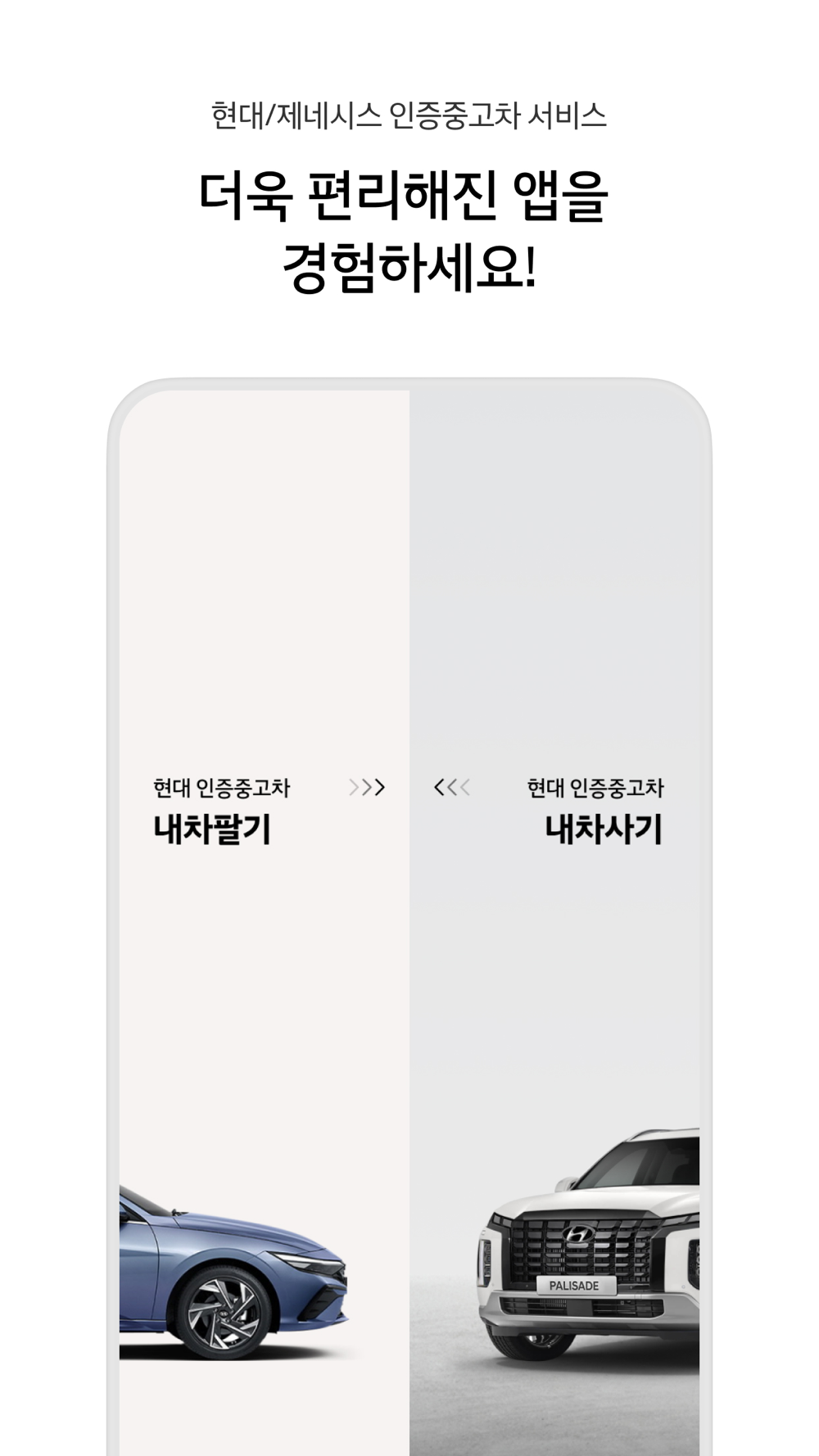 시세조회부터 방문평가 신청, 대금 지급까지 현대/제네시스 인증중고차 App에서 이탈 없이! 내차팔기 논스톱 진행이 가능합니다.