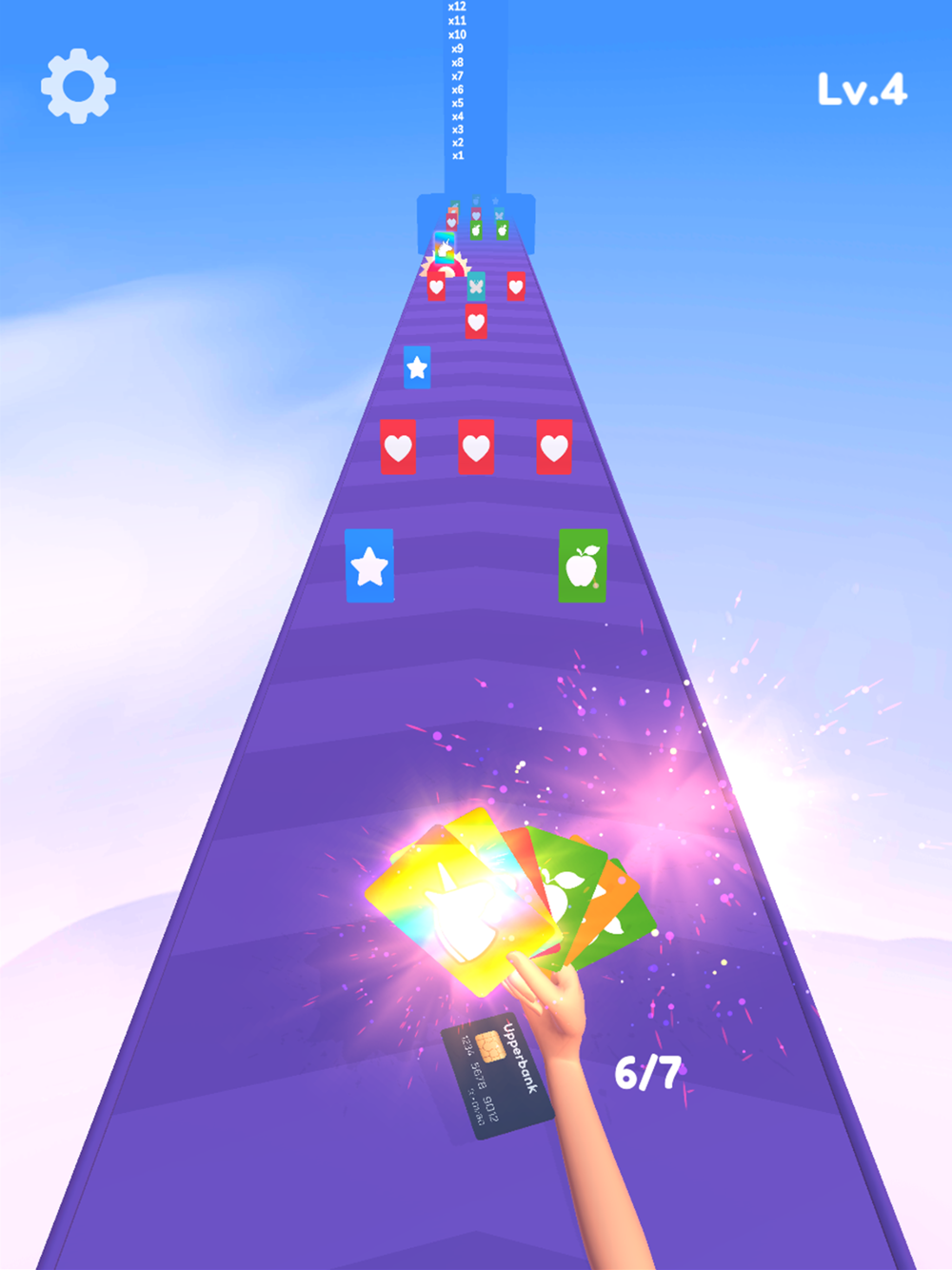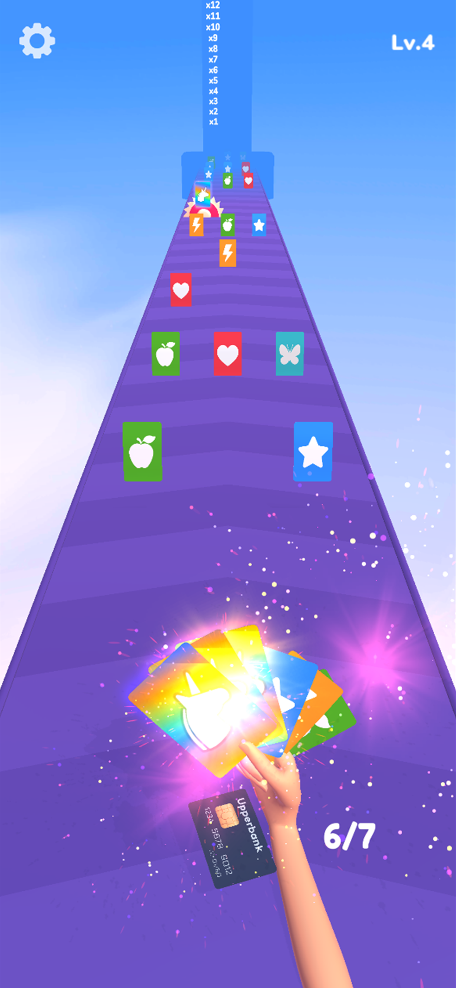 Collect cards, merge cards with same icons. Earn money by merging cards and keep them in your credit card.