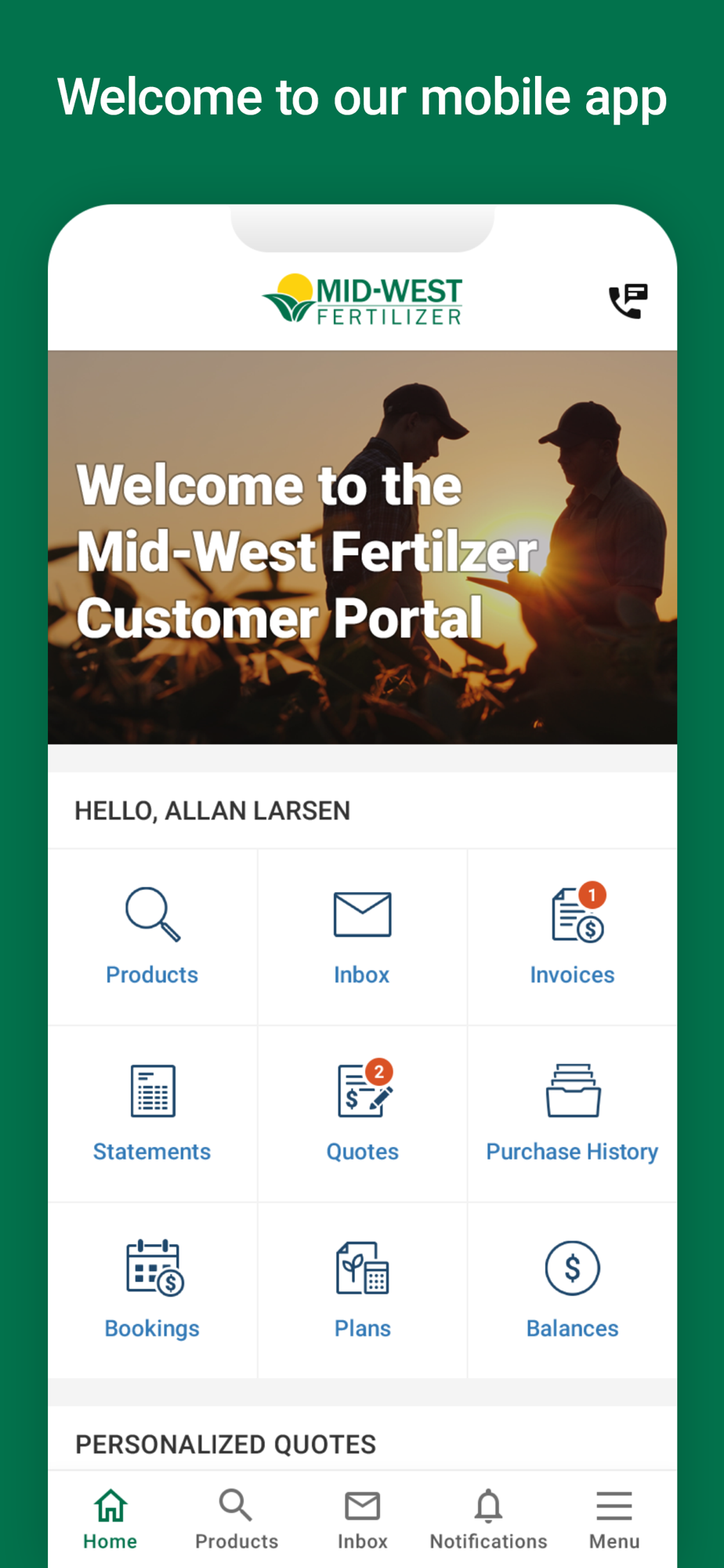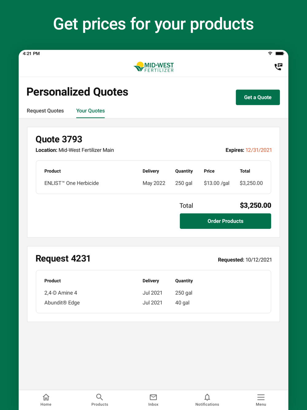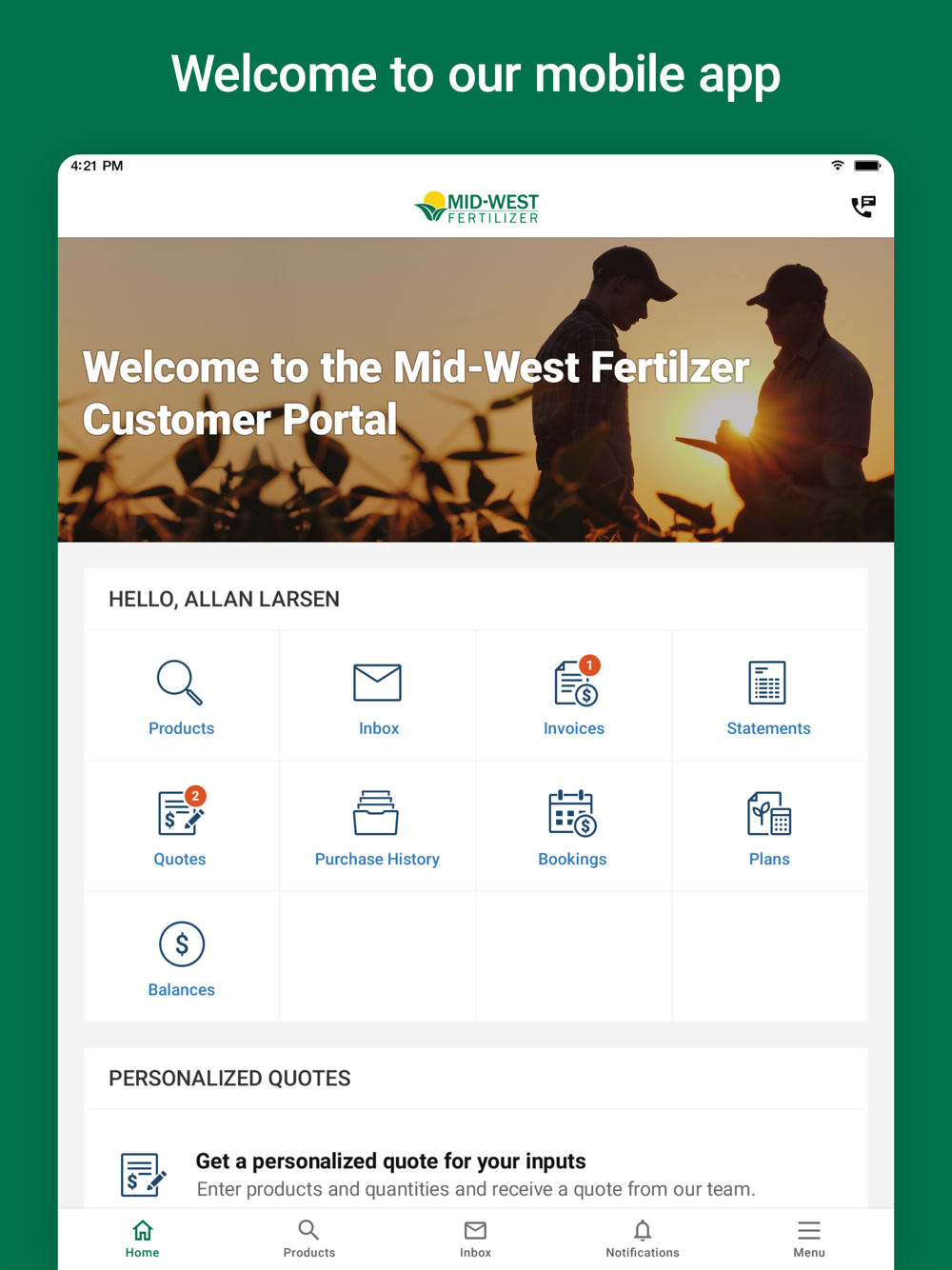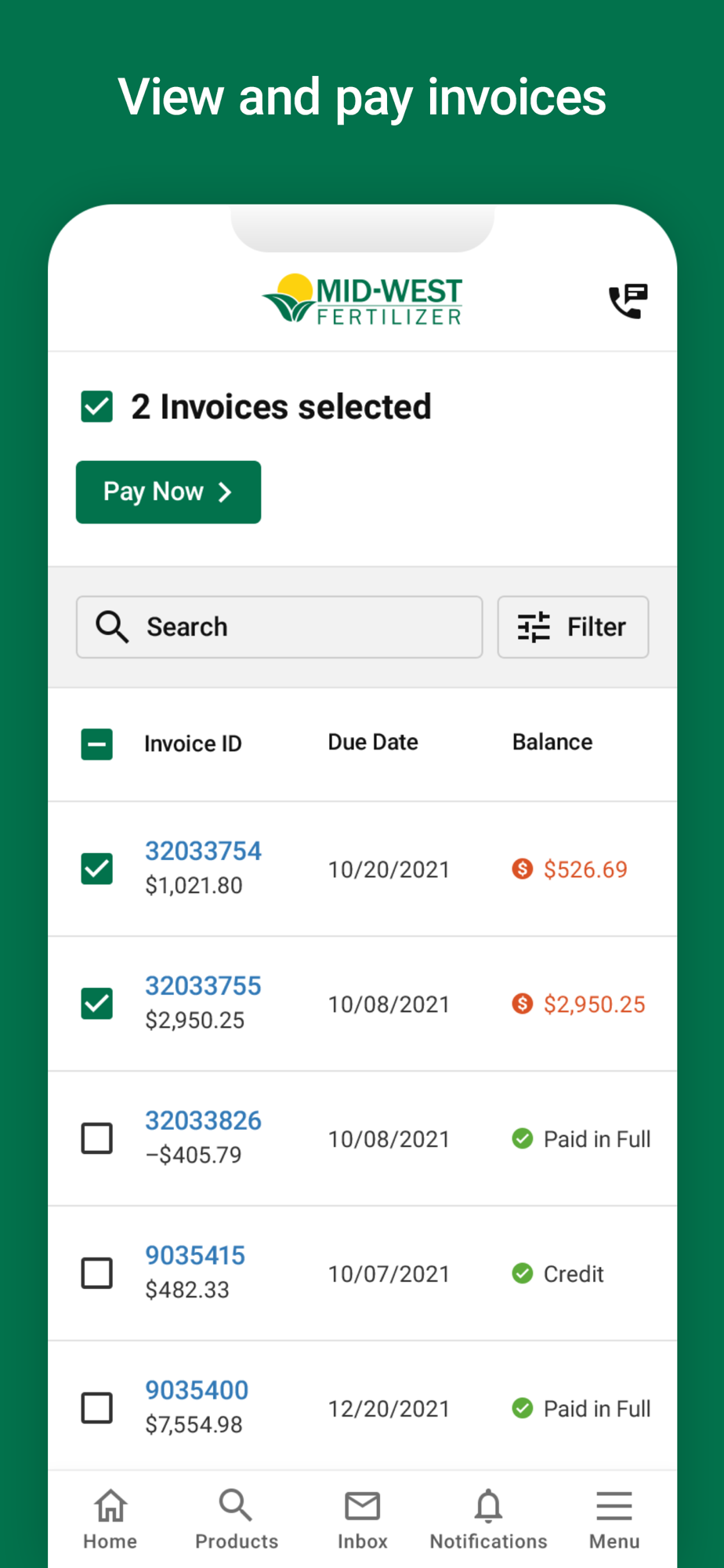 • Easily look up all of your Mid-West Fertilizer account information. Find all of your previous purchases or view and pay your invoices in a few clicks.