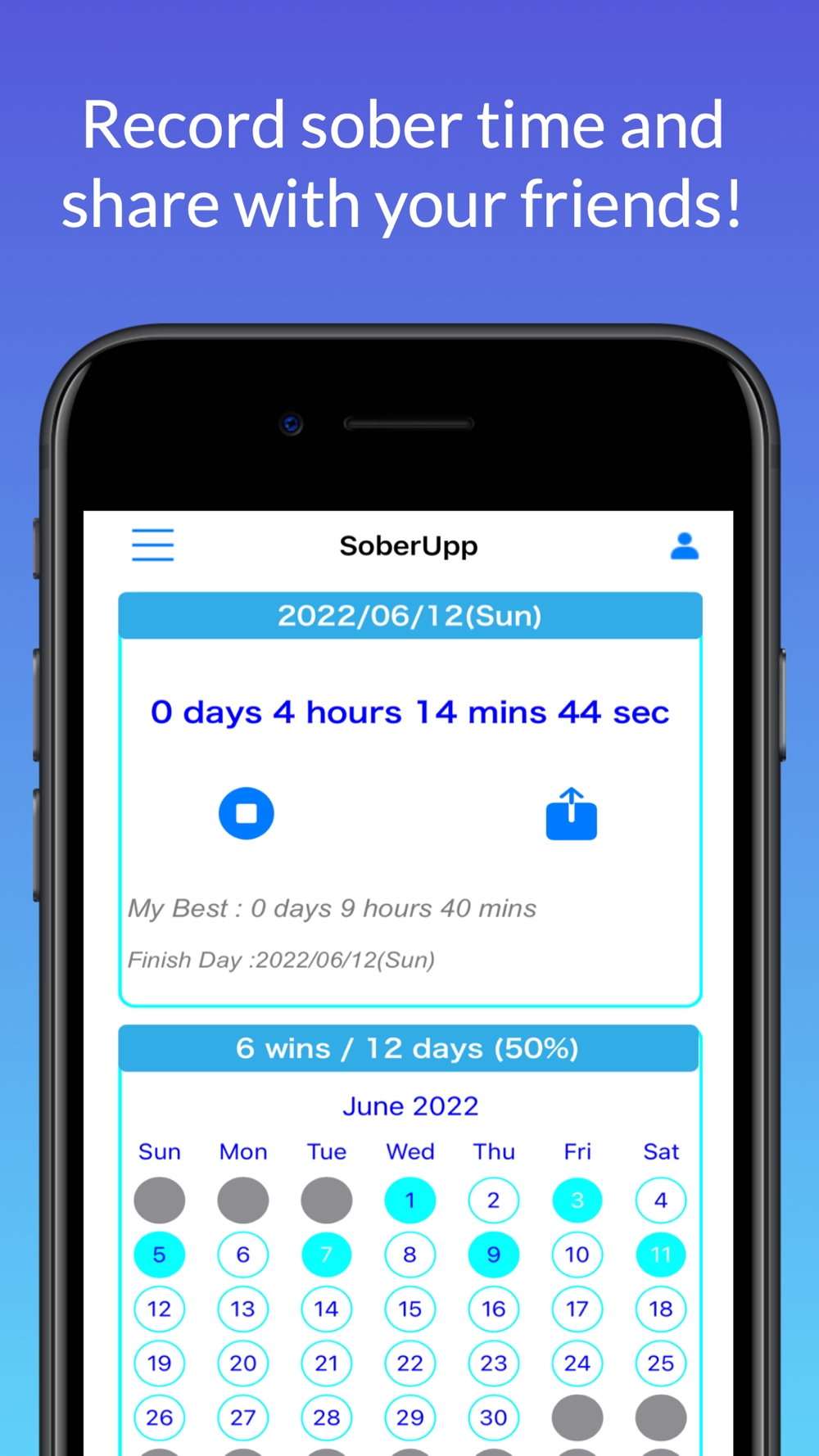 Just 2 clicks and keep your drinking habit right ! Record your sober time and share with your loved ones. Sync with AppleHealth to track your steps (daily/weekly/monthly/yearly). Share your records and photos to SoberUpp community for your motivation ! Check news & blog feeds for living sober ! The only 1 SNS for sober curious like you !!