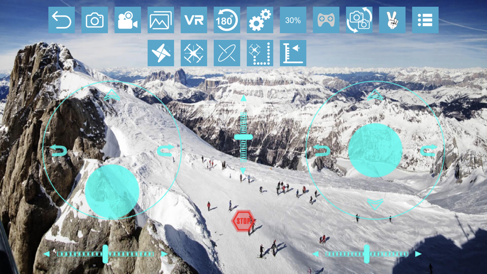 该APP配合飞行器,调用手机WiFi接收图像数据,从而可以在APP中实时显示图像数据。显示图像数据效果,同时还可以对接收到的图像数据进行保存查看。显示图像数据的时候,也可以通过游戏摇杆进行传输数据。