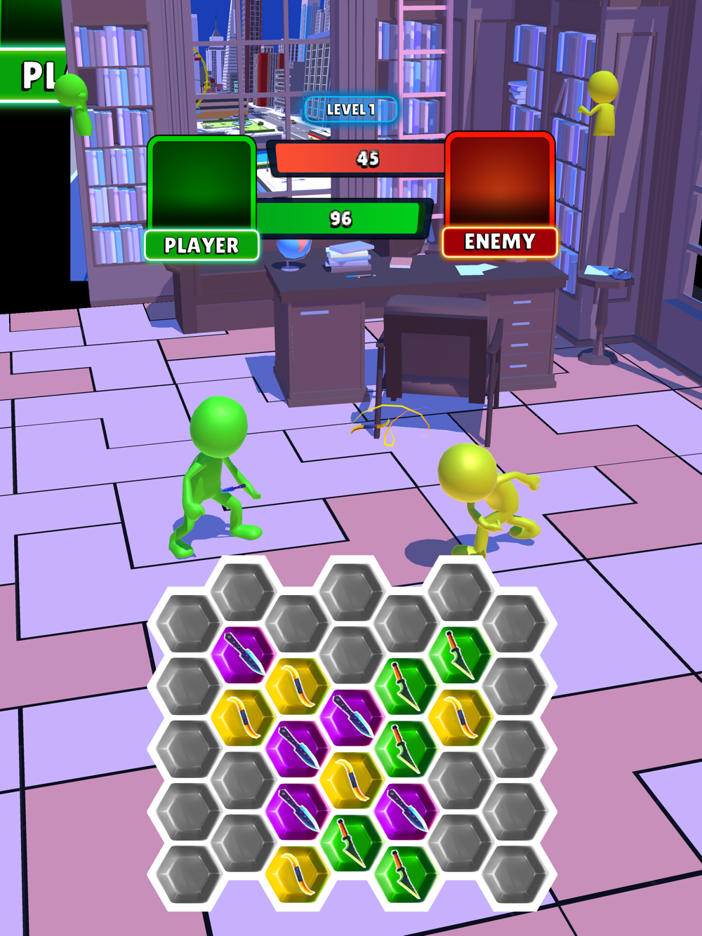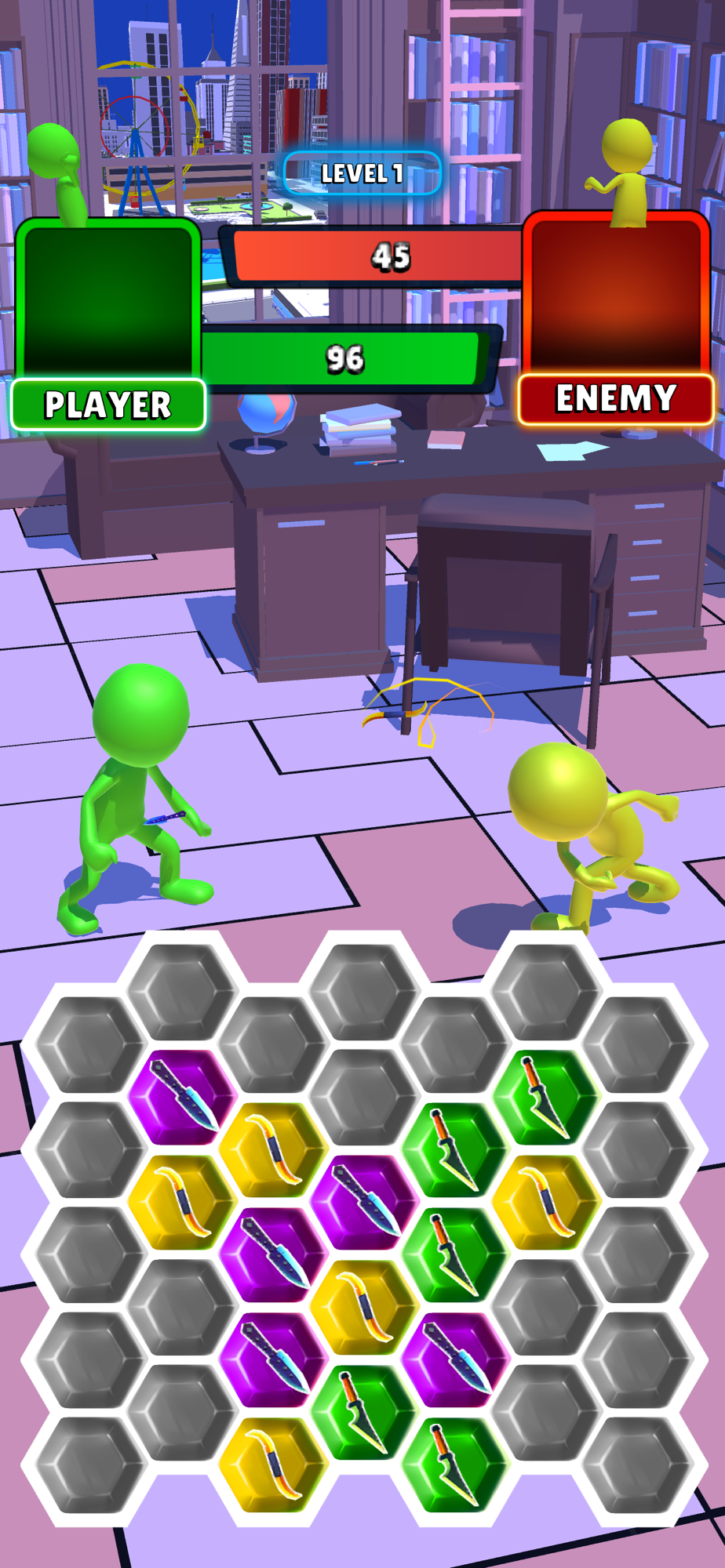 -Your character, your enemy, and a 3D matching puzzle with amazing knife tiles will appear.
