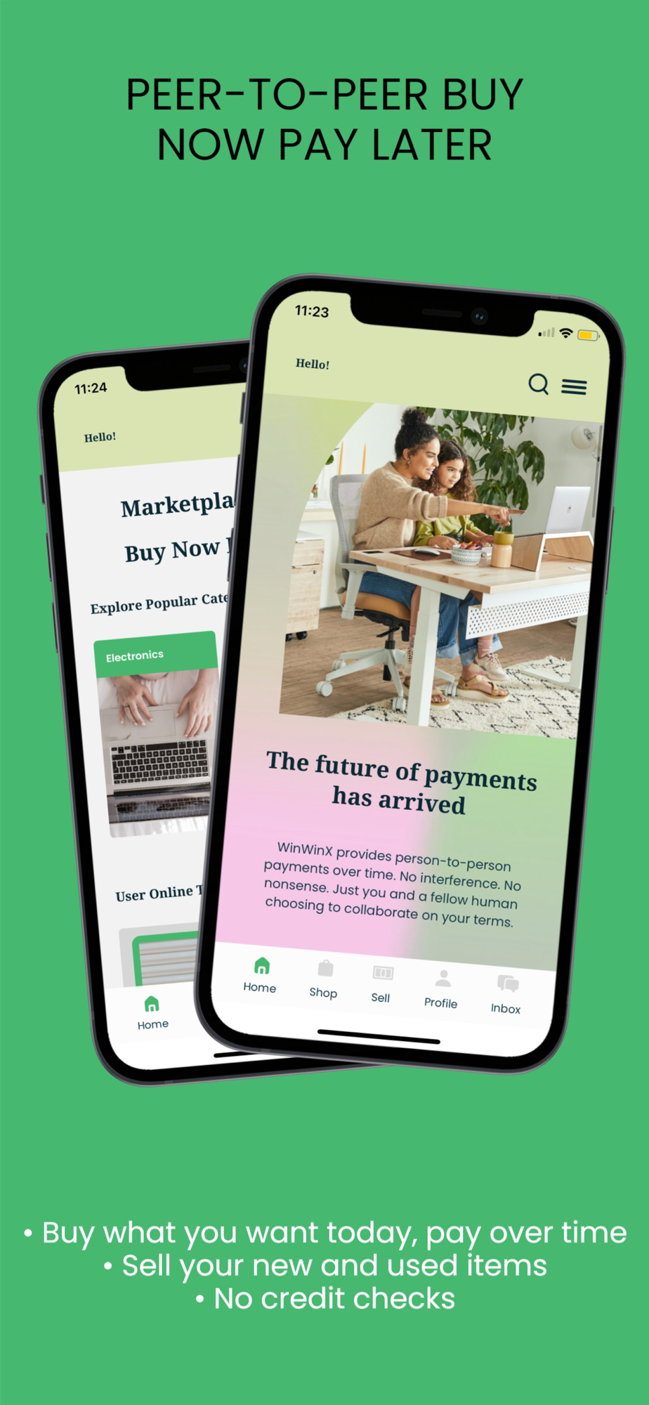 WinWinX is a person-to-person (P2P) Buy Now Pay Later (BNPL) platform. That means Sellers don’t need a store to participate. And Buyers make purchases from a fellow human, using a handy peer-to-peer payment plan. Join us on the WinWinX Marketplace, where anyone can buy or sell new and used products and services.