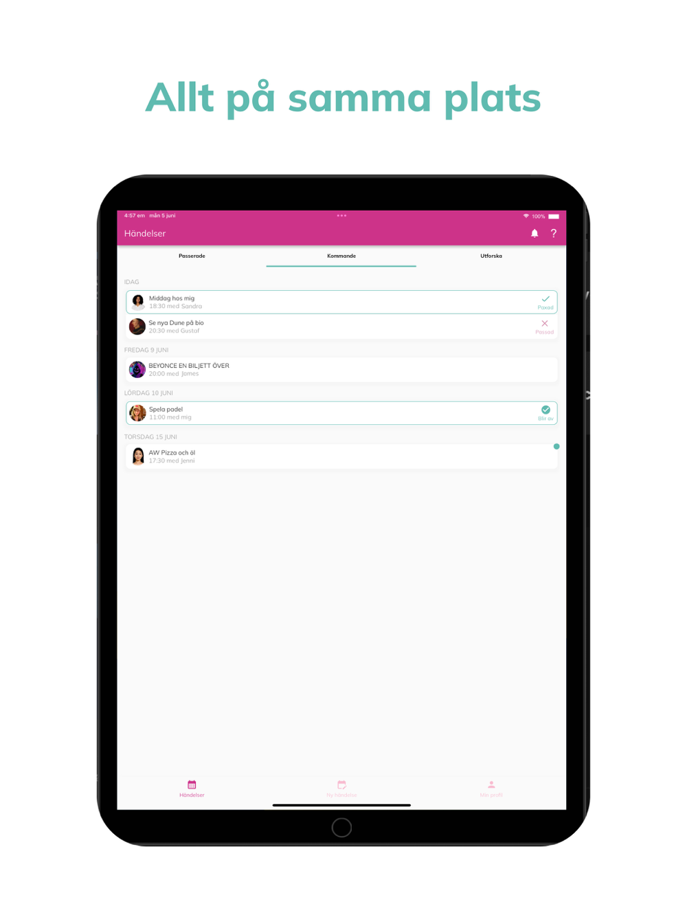 Create an activity you want to do and easily send a notification to your friends. Whether it's a game of padel, babysitting, or a spontaneous coffee break, you can invite as many people as you want. Your friends then reserve their spot. If there's only room for four people on the padel court, no more than four people (including you) can reserve a spot.