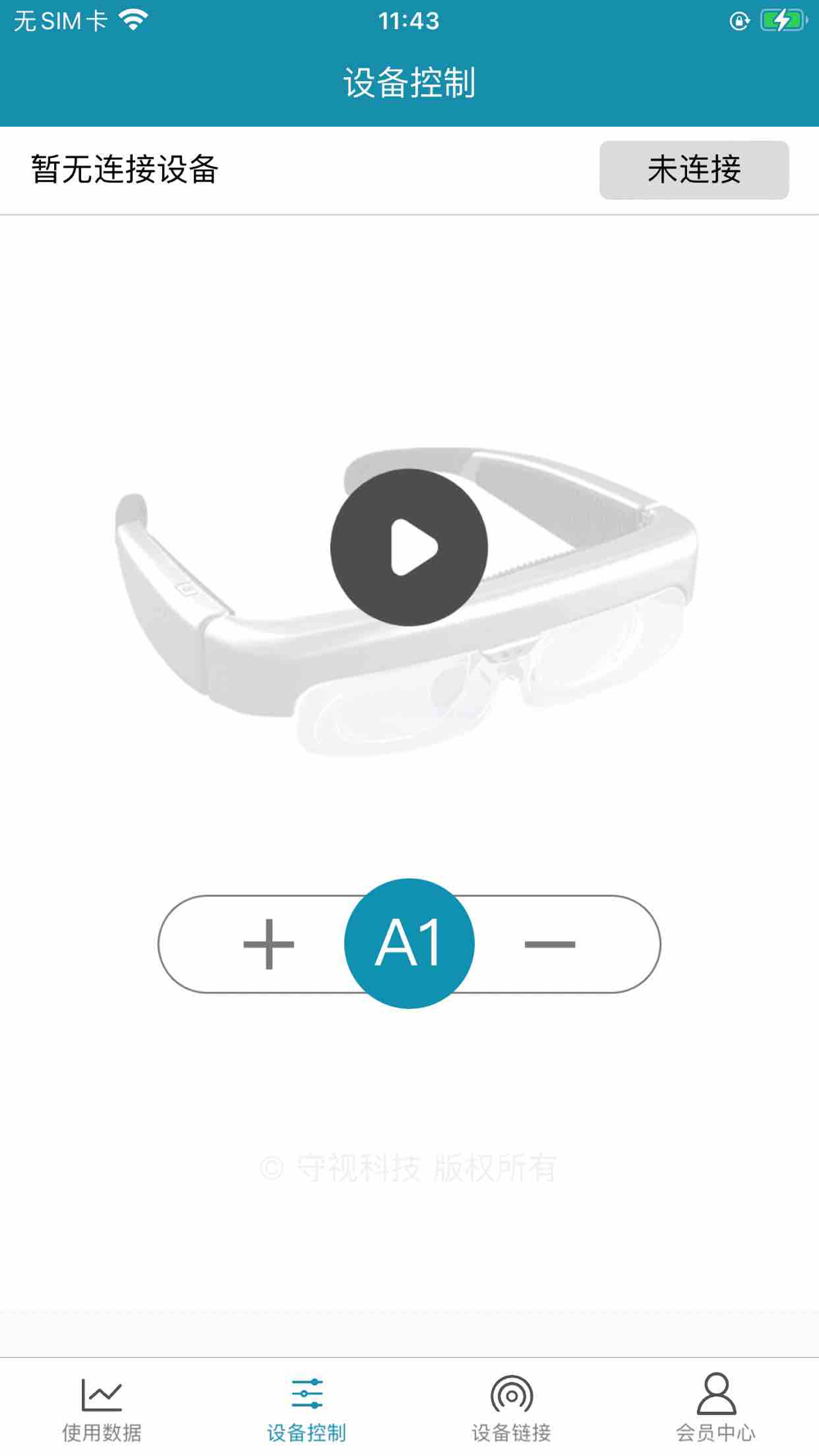 守视科技APP主要是控制守视智能眼镜,APP通过蓝牙与智能眼镜连接后,可以对智能眼镜进行调通,让设备按照设置的档位进行运行,可以让设备暂停,可以让设备重新开始运行,可以通过档位调节按钮让运行中的设备执行换挡操作。
