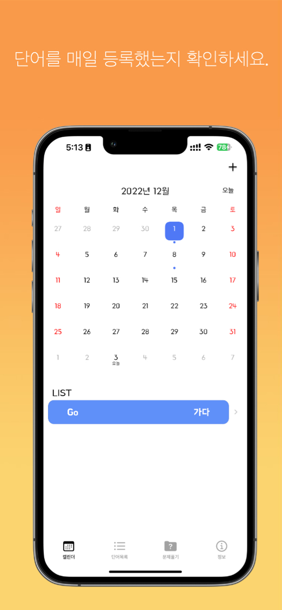 단어를 등록하면 캘린더에 작은 동그라미로 체크가 됩니다.