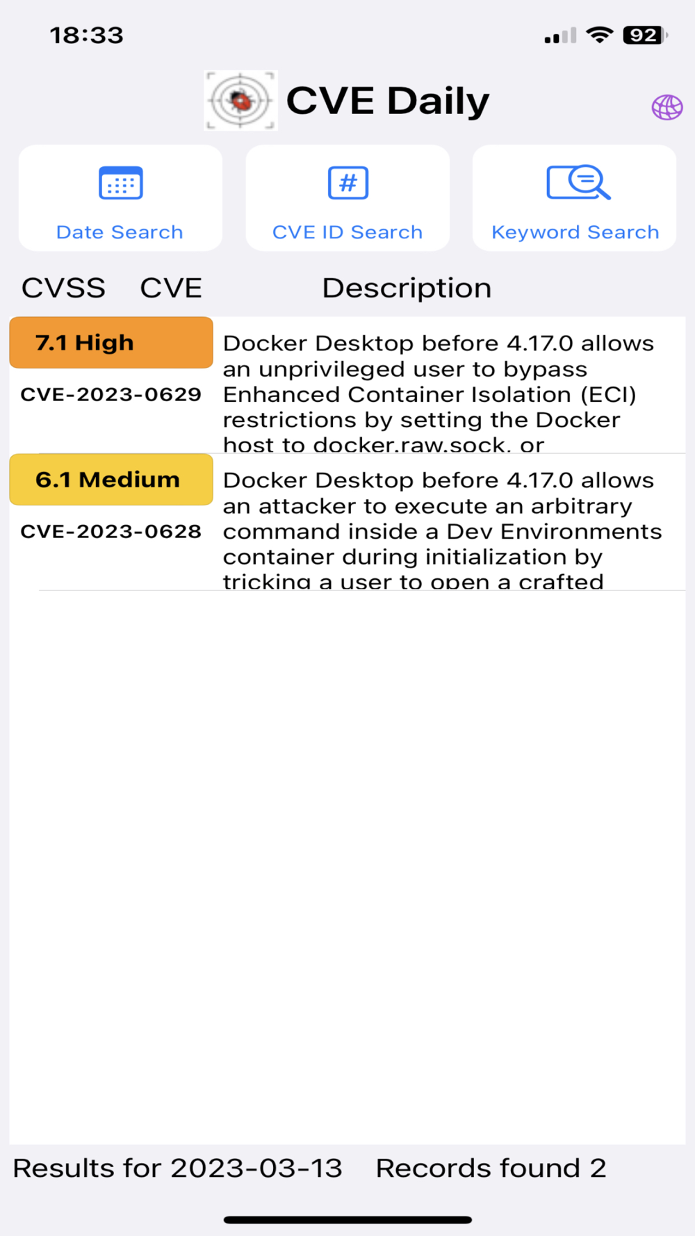 The initial list of CVEs is for the current day and users can select any day in the past to see the related records.