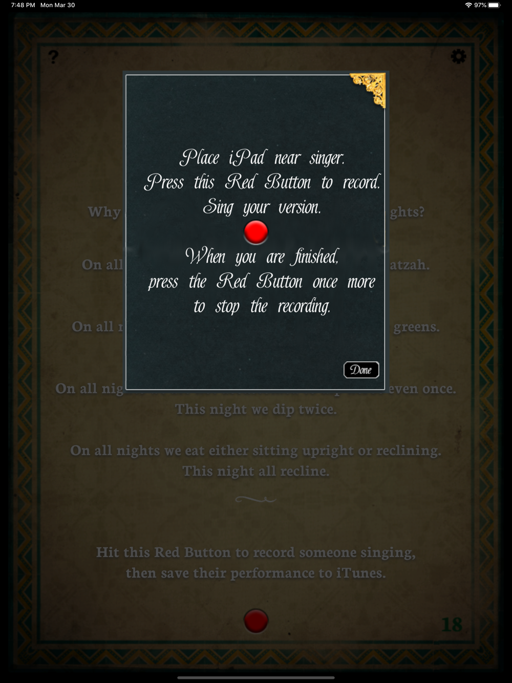 •The Four Questions, typically recited by the youngest family member, can now be recorded directly into the app and saved for posterity in an audio scrapbook in the app or transferred to iTunes.