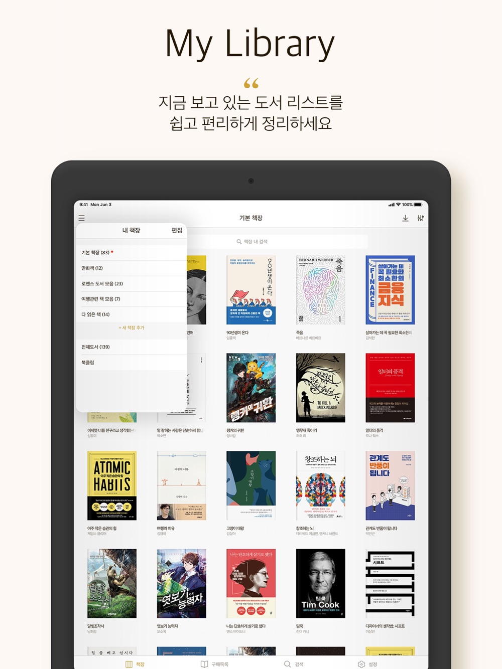 - 기기 변경 또는 앱 재설치 전 책장 백업 후 동일한 책장과 도서리스트로 복원 가능