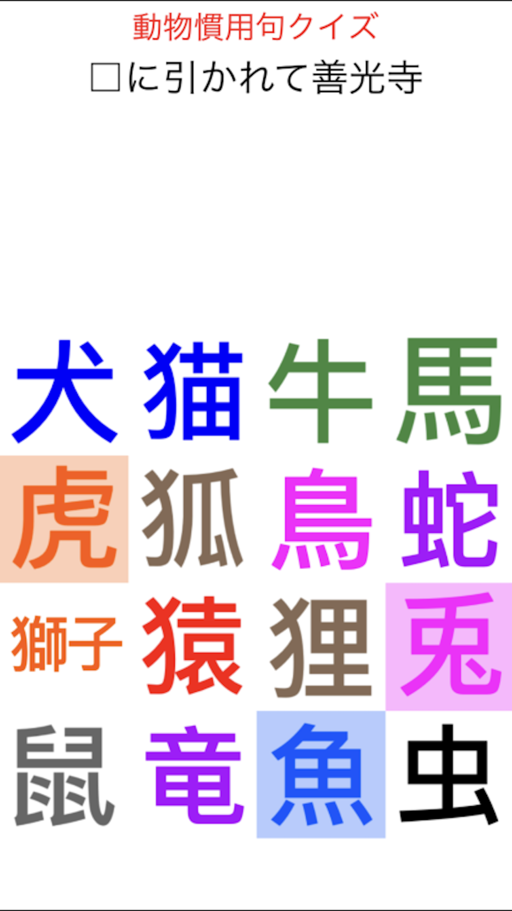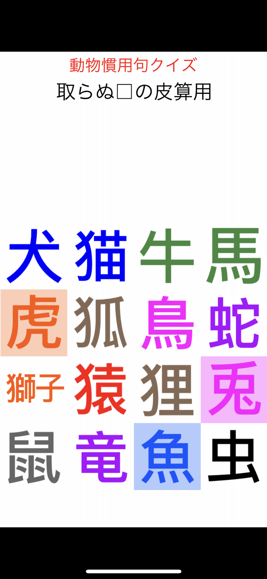 下段のパネルから適切な動物漢字を選んでタップして下さい。