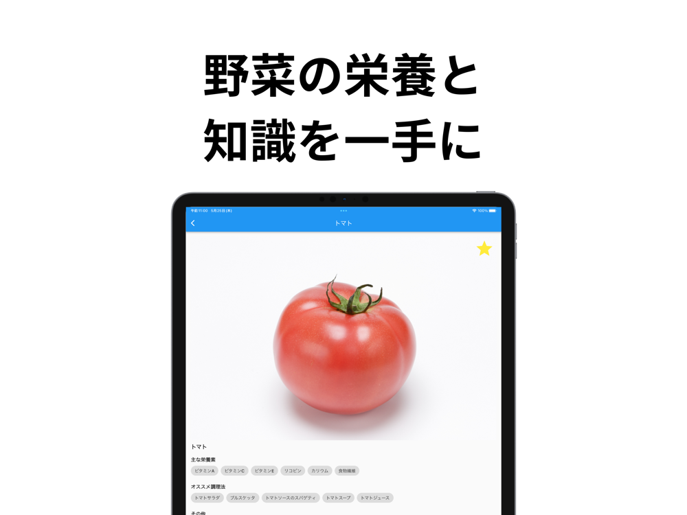 本アプリは野菜の特徴、栄養素情報、おすすめの調理法といった情報を一手に提供します。