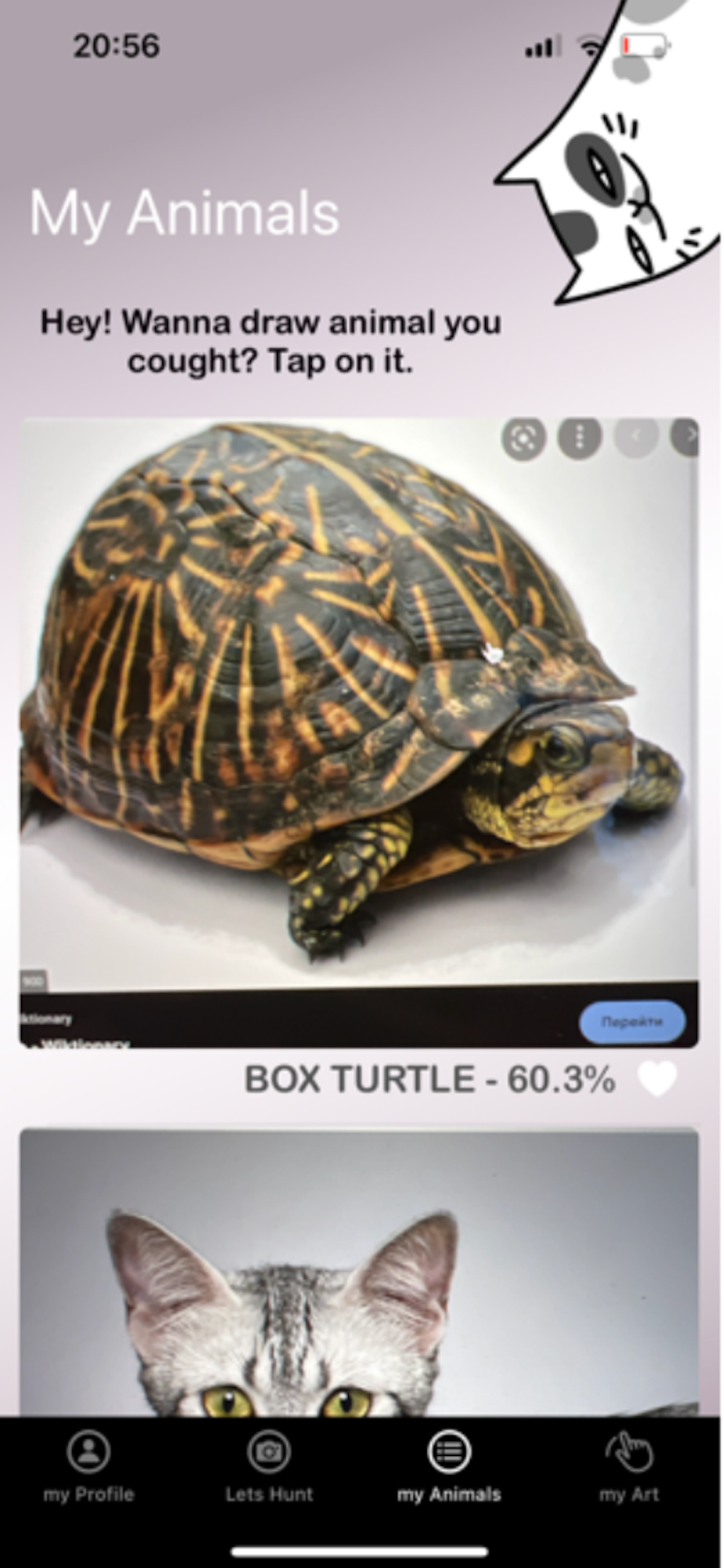 An app for animal photo-hunting. Encourages user to spend more time outdoors, in parks, in zoos, observing and studying animals. Expands their horizons and inspires to travel. By capturing an animal on camera, the user will get it on the photo-trophy list and learn its name. After that the user can draw it as he or she sees it.