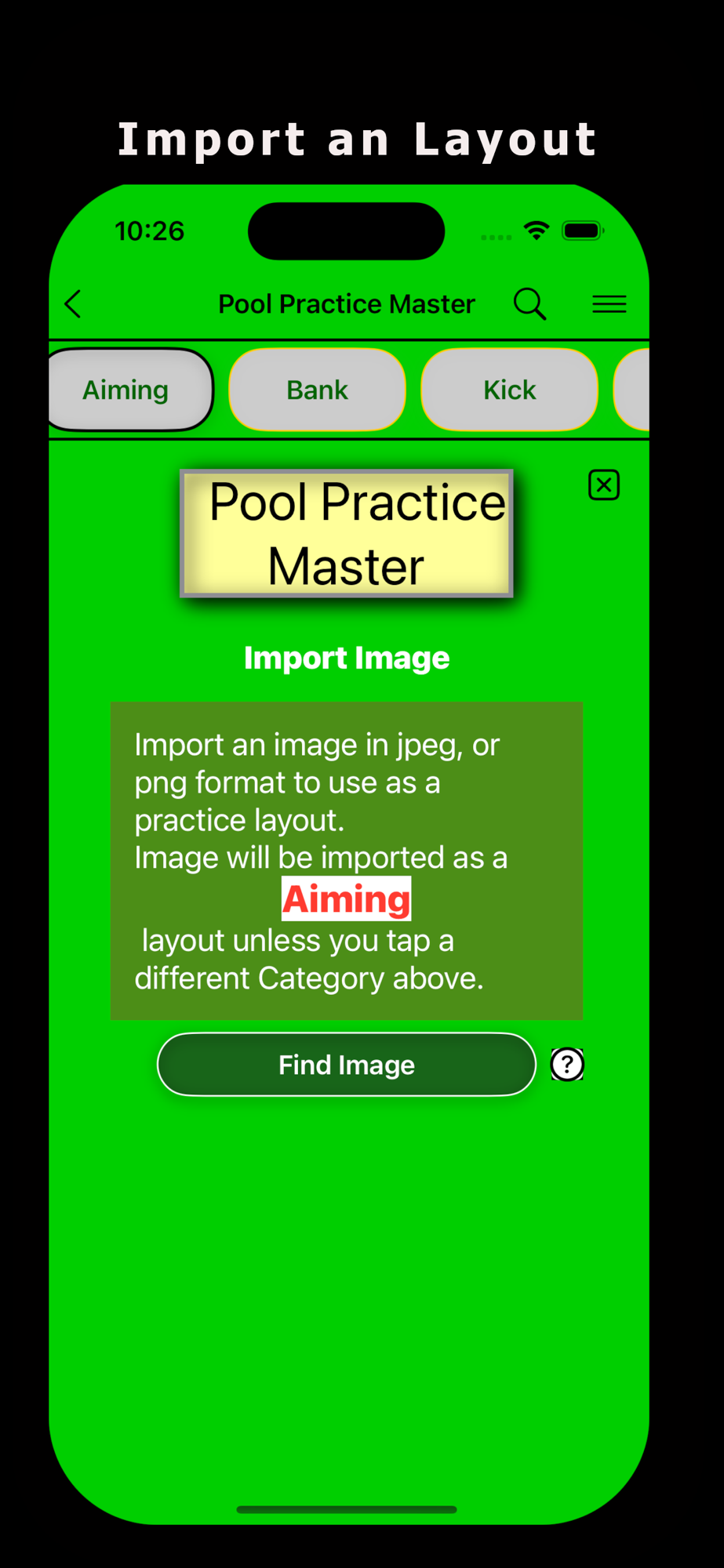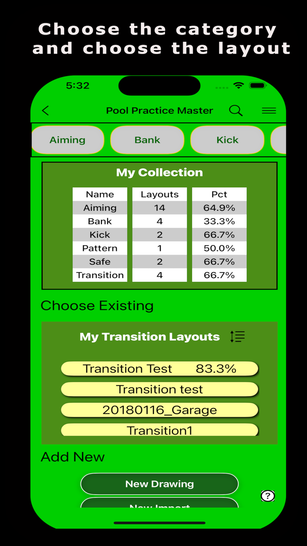 Pool Practice Master supports all types of drills, Aiming, Bank, Kick, Safety, Pattern and Transitions/ You can draw your own layout and save it or import a picture. You can record as much detail about your shot as you want, from Pocket/Miss to indications of how yo missed, Over cut /Under cut, too much spin, too little etc.