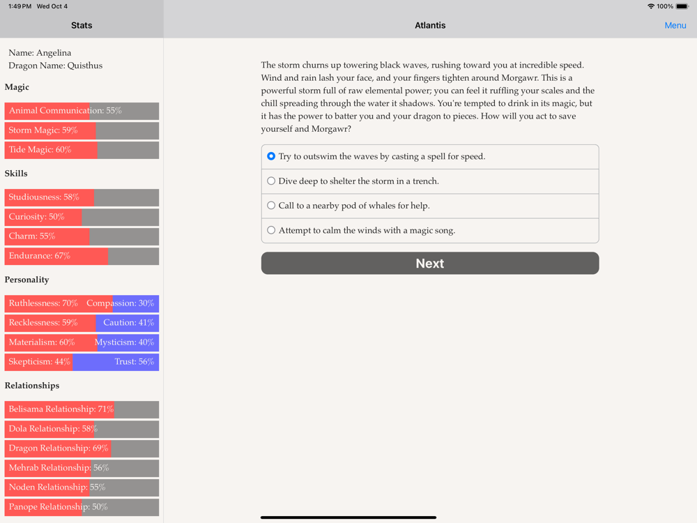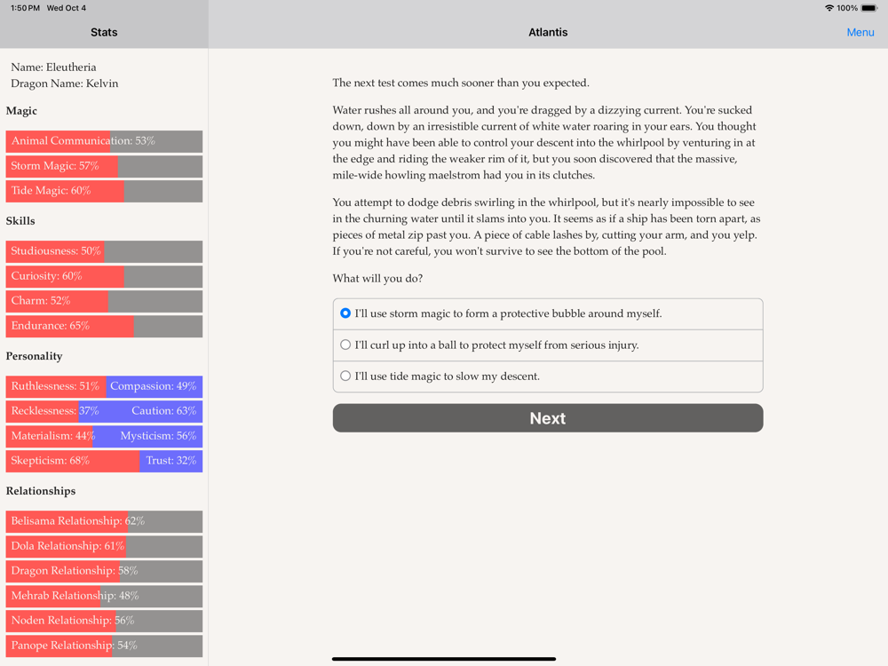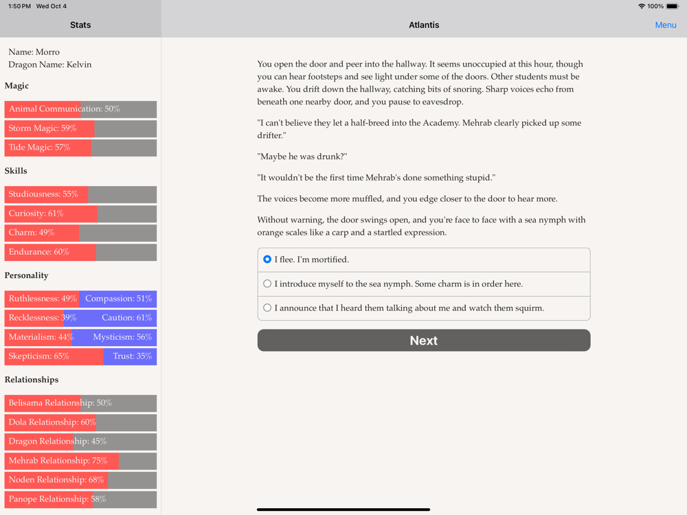 “Atlantis Academy” is a 250,000-word interactive underwater fantasy novel by Dorothea Sparrow, where your choices control the story. It's entirely text-based—without motion graphics or sound effects—and fueled by the vast, unstoppable power of your imagination.