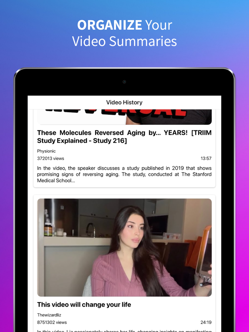 > Video Summary History - Revisit your learning journey with our history feature. Keep track of all the videos you’ve summarized, making it easy to review past insights or continue learning from where you left off.