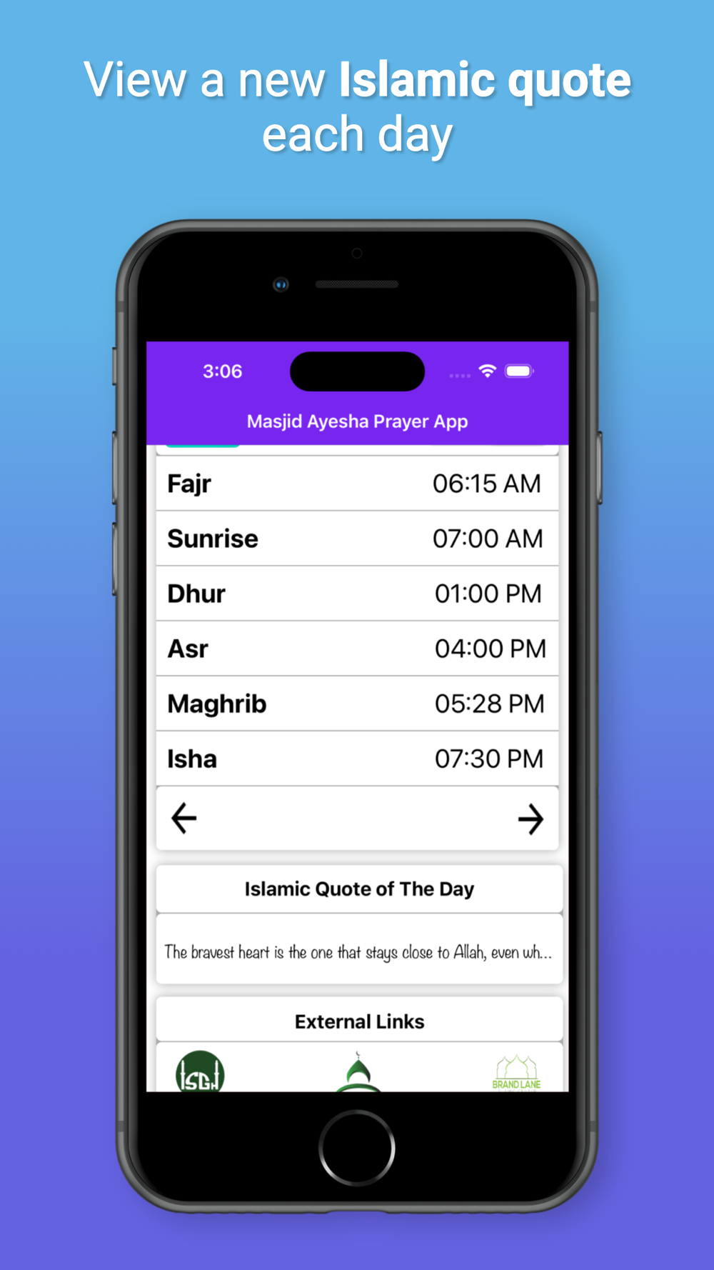 This application will help keep track of Masjid Ayesha prayer schedule including both Azaan and Iqamah!