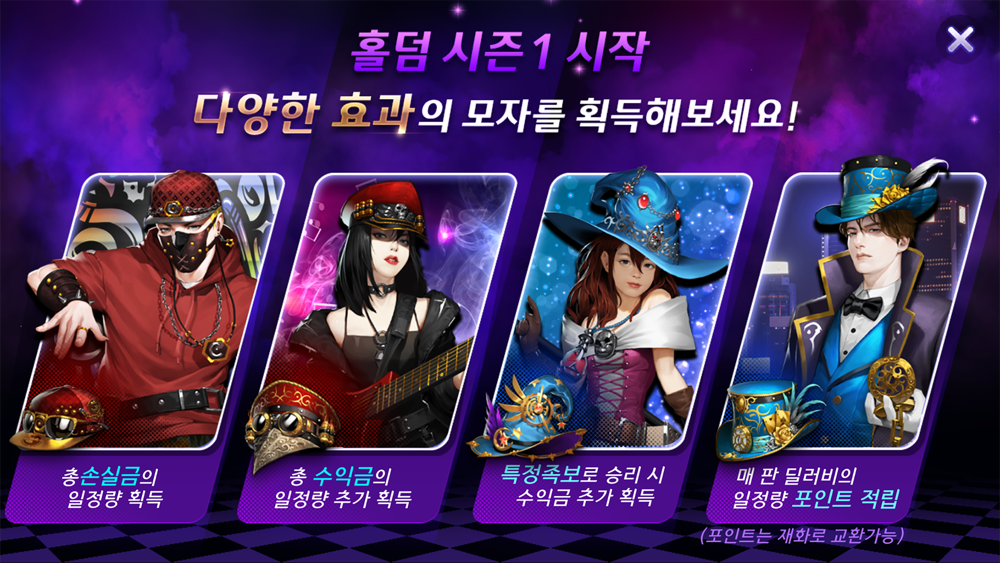 시즌 모자 - 손실금, 수익금, 족보 승리, 딜러비 할인 등