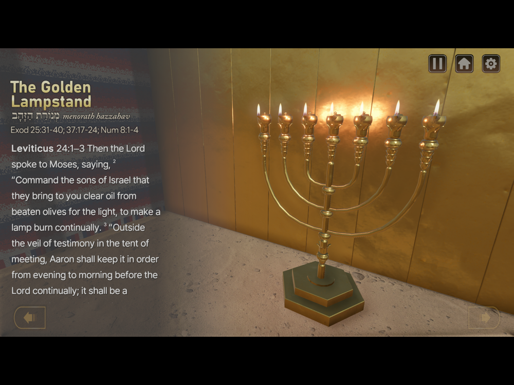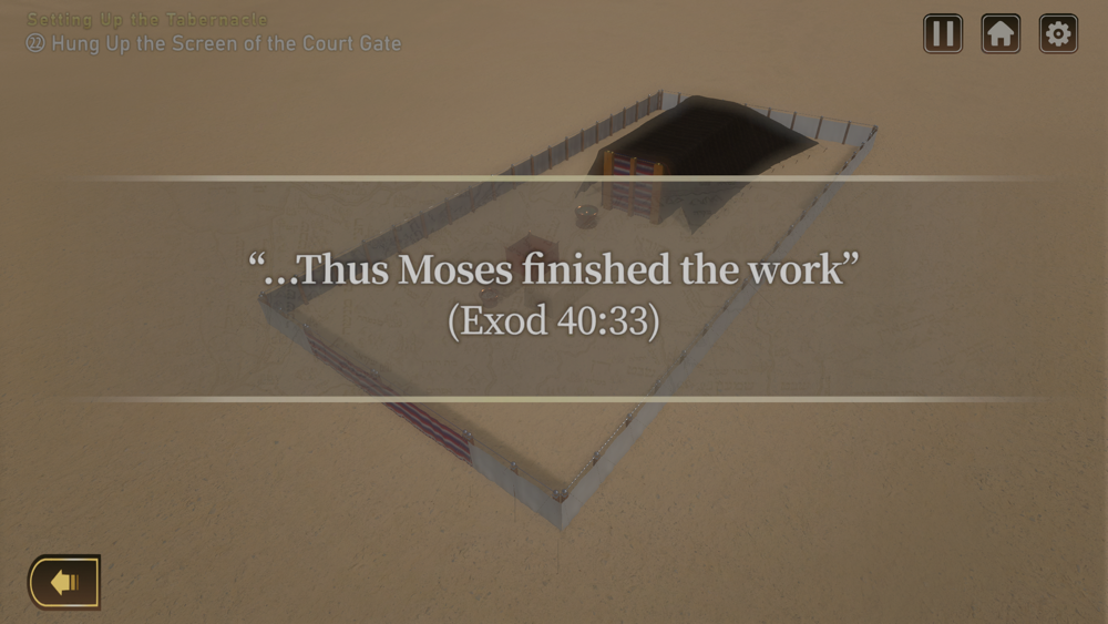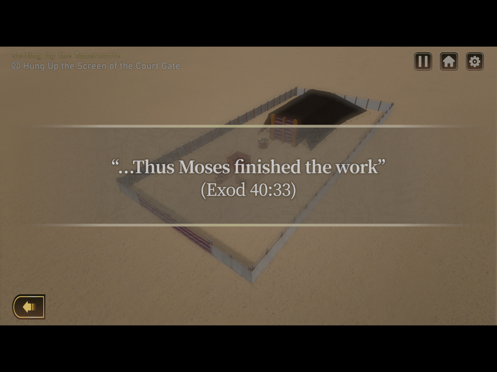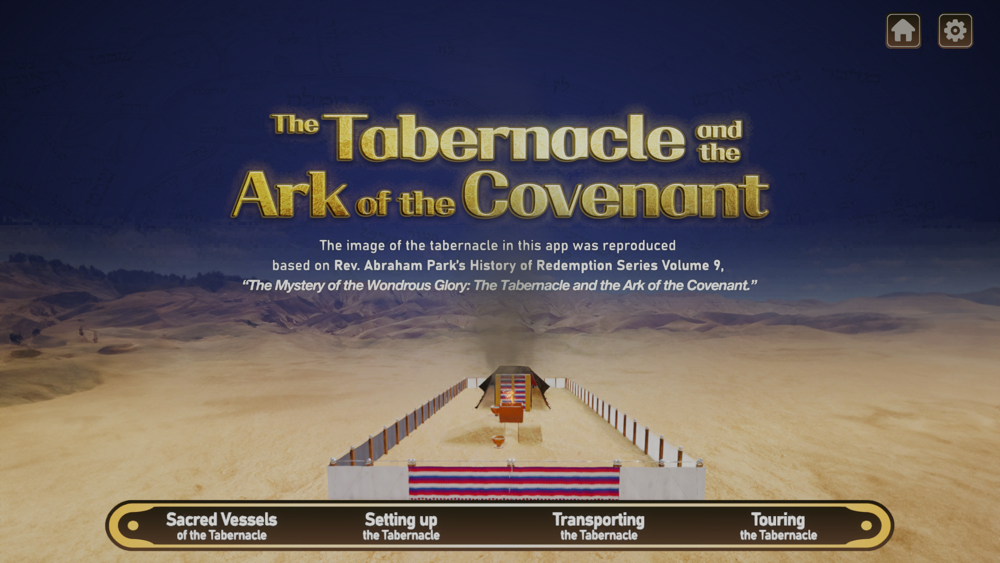 The tabernacle that God showed Moses is known as the “gospel of the eyes.” We believe that seeing the tabernacle just as Moses did with his own eyes would bring us greater understanding of God’s will reflected throughout the tabernacle than we would by just reading the Scripture. Hence, this application graphically reproduced each holy vessel, pattern, and set-up order of the tabernacle according to the Hebrew text in the Scripture. The interpretation of the Hebrew original text was based on Abraham Park’s “The Mystery of the Wondrous Glory: The Tabernacle and the Ark of the Covenant.”